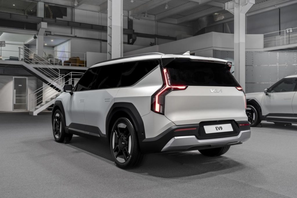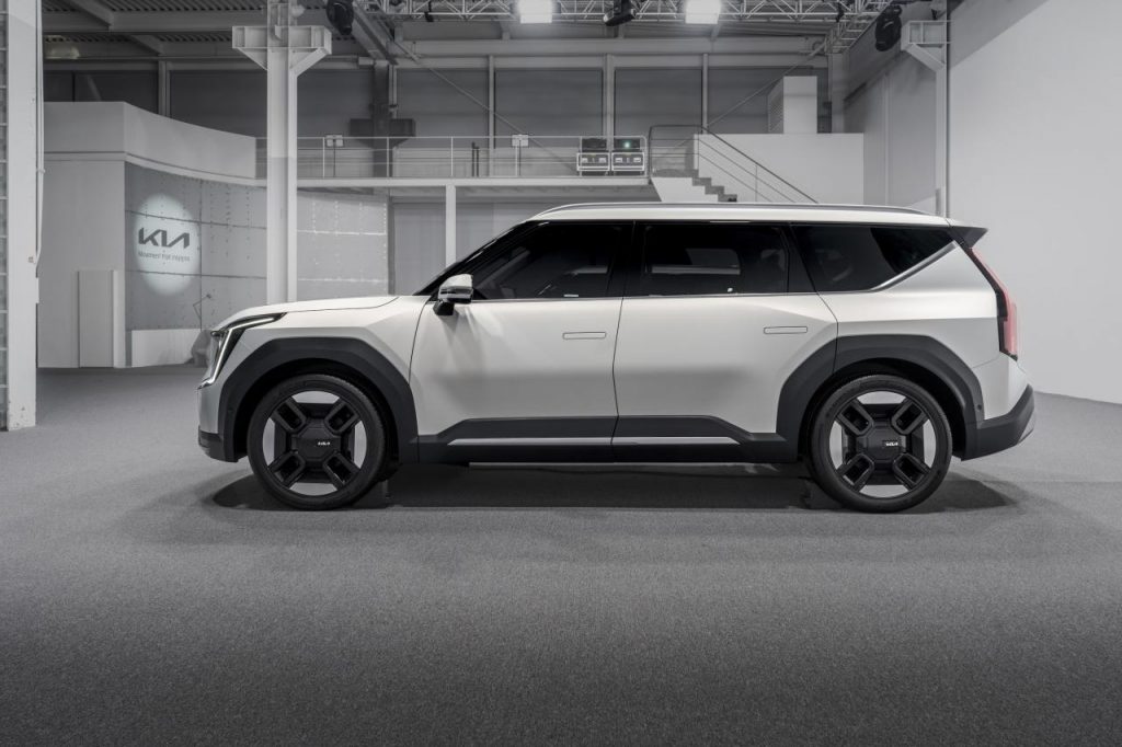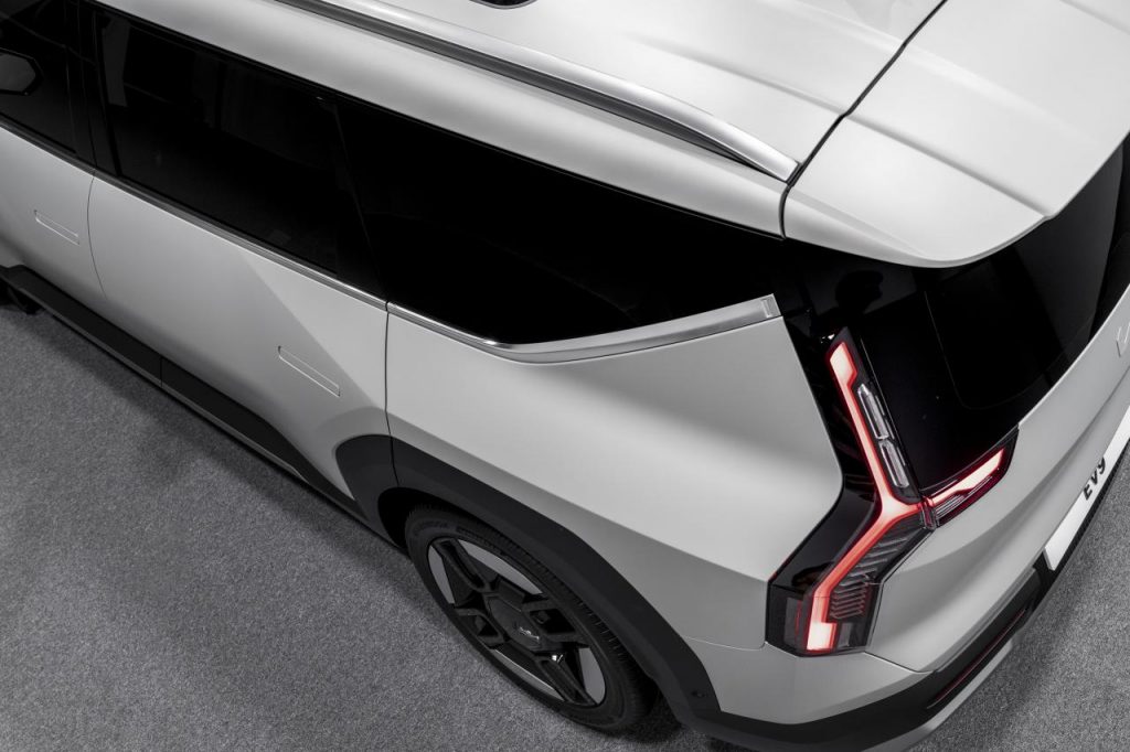 Le nouveau Kia EV-9 était annoncé via le concept portant le même nom en 2021 et dévoilé au salon de Los Angeles juste après le lancement de l’EV-6. Kia avait d’emblée annoncé que l’orientation du design « Opposites United » – traduisez par l’Union des contraires – rencontré sur l’EV-6 prendrait une plus grande dimension sur ce second opus de véhicule électrique. On peut se féliciter de voir que les premières images du modèle définitif le montrent très proche du concept – donc de la philosophie – original. Kia insiste sur une fusion voulue entre caractère fort du SUV et fluidité naturelle d’un véhicule électrique. Un des piliers de la philosophie « Opposites United » est ce que les designers de la marque définissent comme l’Audace conjuguée à la Nature. Le style de l’EV-9 dévoile donc une silhouette nette, fluide et parfaitement identifiable de SUV moderne. Et comme pour souligner cette ligne évidente, Kia a choisi de complexifier les flancs par des jeux de courbes, de lignes géométriques et de matériaux asseyant parfaitement le modèle visuellement.