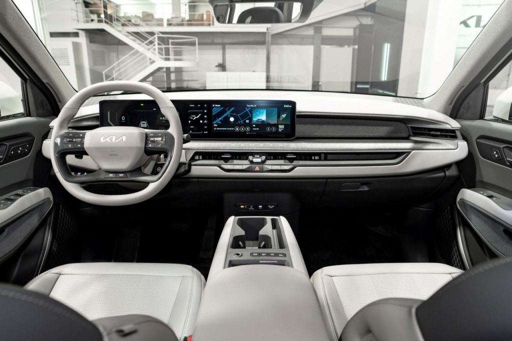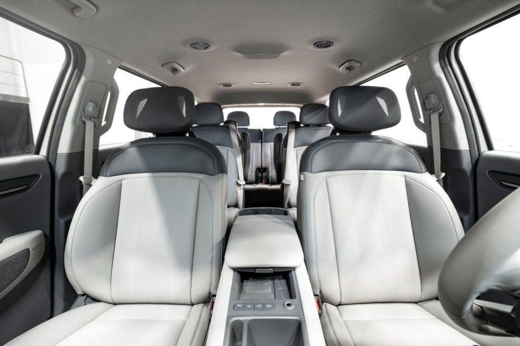 Rappelons que l’EV-9 est fabriqué sur la toute dernière plateforme modulaire de la marque – E-GMP de son petit nom – lui permettant un bel empattement et un sol complètement plat consacrant donc à l’habitacle tout le volume intérieur dont il a besoin. L’EV-9 sera donc disponible en 6 places (comme sur les photos) ou en 7 -vraies – places. Kia affirme avoir travaillé cet habitacle en fonction des retours reçus de la part de familles sur les différentes configurations d’assises. Plus globalement, la marque a tout fait pour qu’aucune des places assises de l’EV-9 ne soit vécue comme une punition, et a tenté quelques innovations. On retient notamment une configuration intéressante présente sur la version 6 places : la possibilité de pivoter les assises du second rang à 180° pour les faire se retrouver face aux assises du troisième rang.