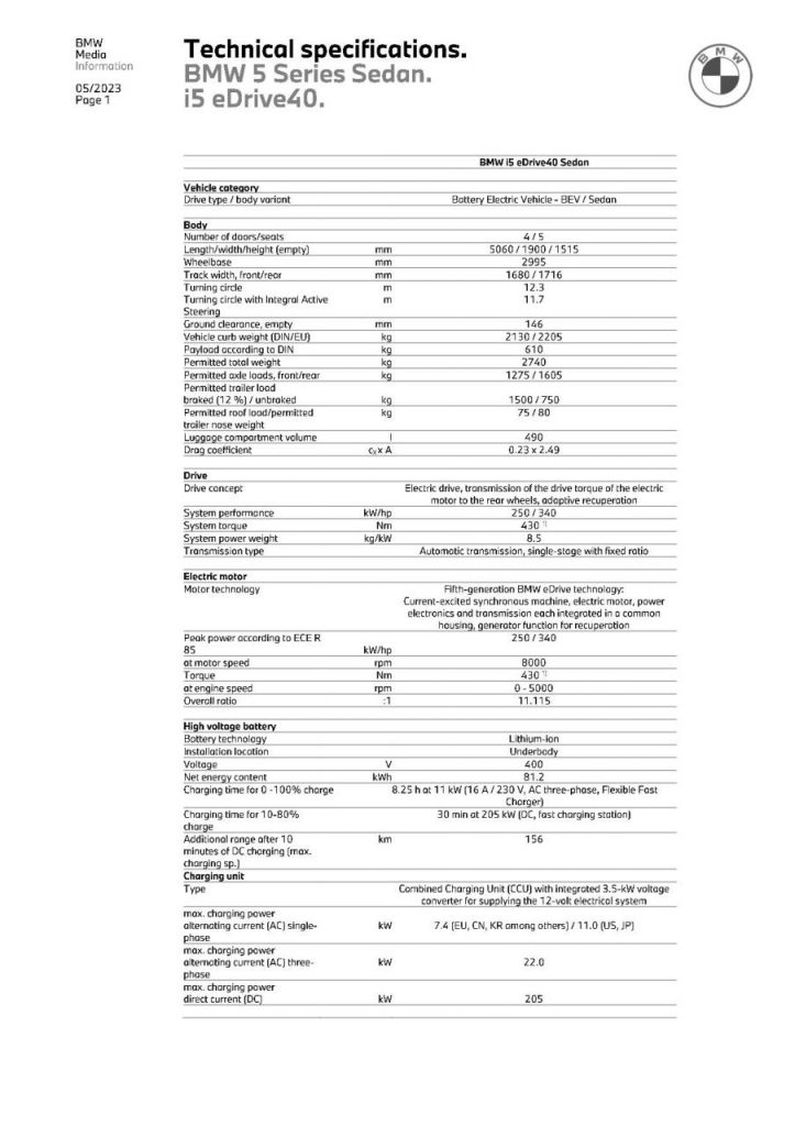 Mais cette i5 M60 ne sera pas la seule motorisation 100% électrique. Il y a aussi la BMW i5 eDrive40 au lancement. Cette version ne dispose que d'un seul moteur, placé à l'arrière. La BMW reste alors une pure propulsion forte de 340 ch (250 kW). Le couple est de 430 Nm en pic. Ici, le 0 à 100 km/h est fait en 6 secondes. Avec la même batterie de 81,2 kWh de capacité nette, cette version a une autonomie de 477 à 582 km WLTP mixte. Il faut dire que le poids est légèrement plus faible avec tout de même 2205 kg EU. 175 kg qui font beaucoup sur l'autonomie sur une seule charge. BMW met dans ses versions électriques un mode Max Range qui limite la puissance moteur et désactive plein de fonctions de confort pour offrir jusqu'à 25% d'autonomie en plus selon les cycles.