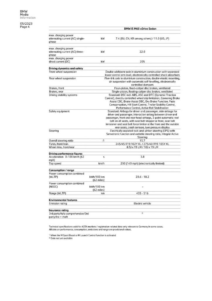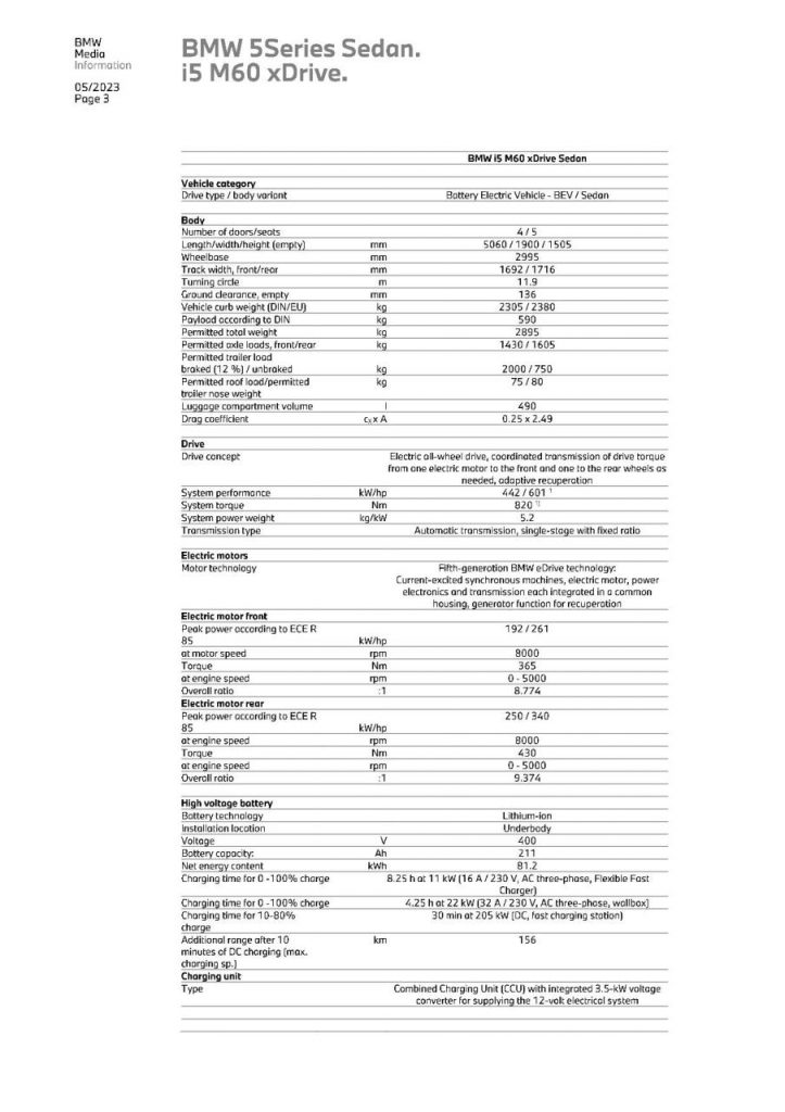 Concentrons-nous sur les motorisations. La i5 M60 xDrive en point d'orgue désormais est 100% électrique. Elle dispose d’une puissance de 601 ch (442 kW). Deux moteurs sont intégrés aux essieux avant et arrière ce qui donne une transmission intégrale. Le couple peut atteindre le chiffre très confortable de 820 Nm en pic (fonction M Sport Boost ou la fonction M Launch Control activée). Malgré son poids de 2380 kg (UE donc avec un conducteur de 75 kg) la BMW i5 M60 fait le 0 à 100 km/h en 3,8 secondes. La vitesse maximale est limitée électroniquement à 230 km/h.