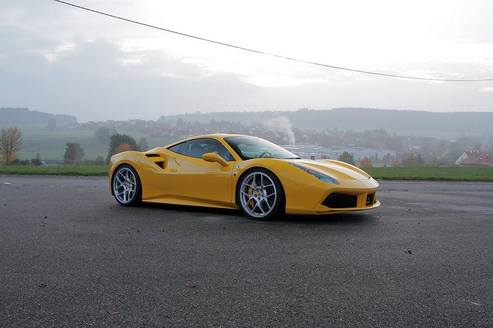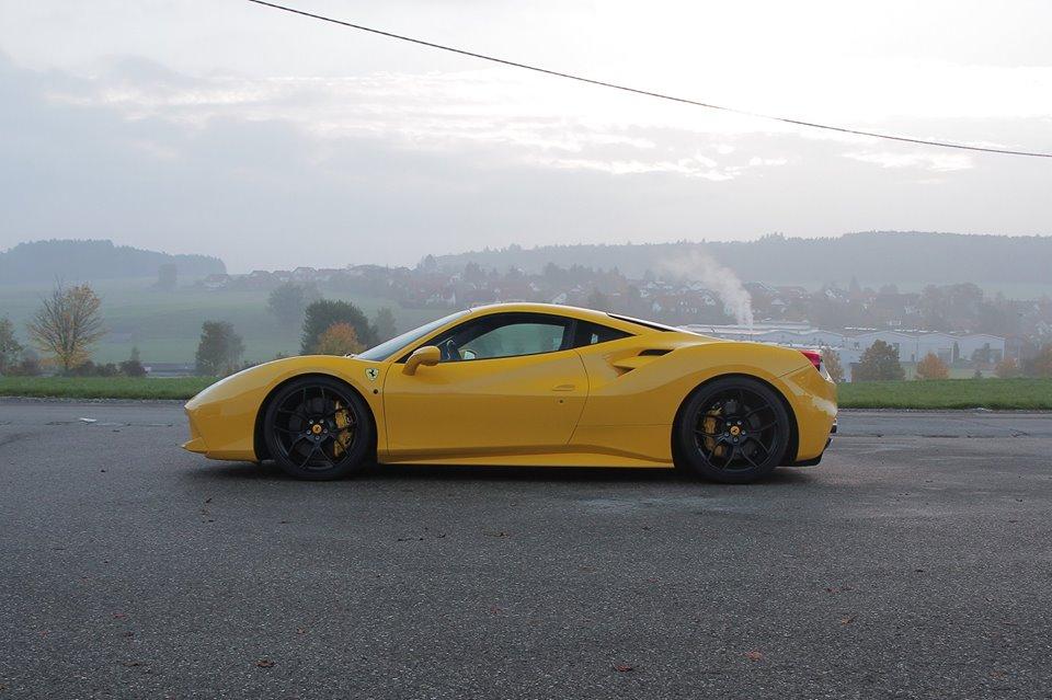La dernière Ferrari 488 GTB passera prochainement par leurs ateliers. Elle se laisse pour l’heure apprécier dans sa livrée de carrosserie Giallo Modena et équipée de jantes (deux modèles distincts). La hauteur de caisse semble également réduite.