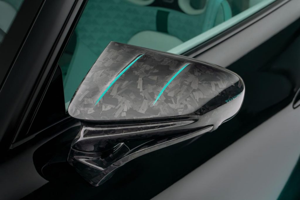 L’intérieur est également repensé dans une teinte bleu ciel. Le volant est habillé pour moitié de carbone et pour moitié de cuir, et les branches latérales du volant sont peintes pour correspondre à la couleur du cuir. Dans la partie supérieure, l'anneau en carbone du volant présente un voyant de changement de vitesse et un affichage numérique de la vitesse et du régime moteur.