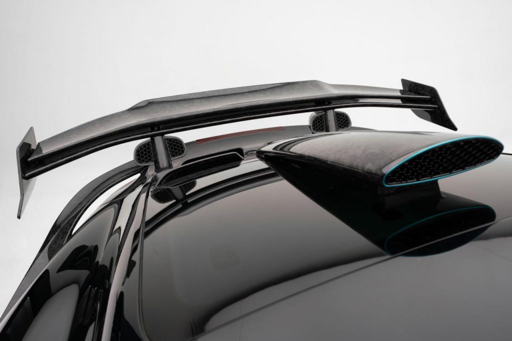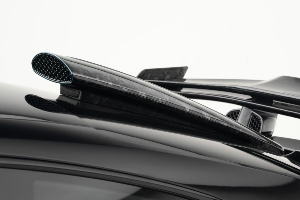 Etant donné que la puissance a été largement augmentée, Mansory a multiplié les prises d’air pour refroidir la bête. Ainsi, on en trouve sur la partie supérieure des ailes mais aussi en extensions dans les prises d’air arrière, tandis qu’une grosse prise d’air supplémentaire façon F1 est ajoutée sur la lunette arrière. A l’arrière aussi, le carbone forgé est visible partout, notamment dans le nouveau diffuseur proéminent à trois sorties d’échappement et le grand aileron arrière rétractable.