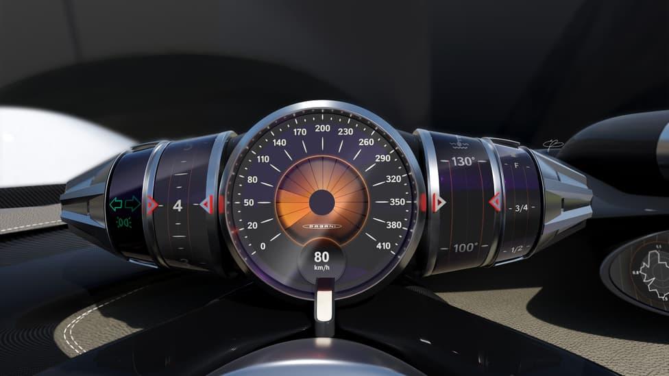 L’intérieur, garni de cuir, est pour l'instant montré sous forme de rendus 3D. Il perpétue la touche néo-rétro de Pagani, dominée par des lignes courbes, des ellipses et des formes ovoïdes, avec une mention spéciale pour l’instrumentation numérique qui évoque l’aviation classique, et ses multiples jauges rotatives du plus bel effet. La console centrale se compose de plusieurs boutons physiques, tandis qu’un lever de vitesse manuel trône fièrement au centre du cockpit.