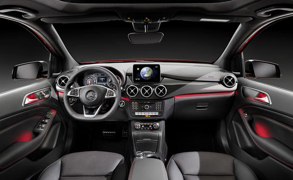 Le changement visuel le plus marquant est sans doute l’arrivée dans une gamme renouvelée de la version AMG Line. Complétant l’offre des versions Style et Urban (jantes 17 pouces, double échappement à l’arrière, sellerie mixte cuir / tissu). Avec son bouclier plus ouvert, ses jantes 18 pouces abritant des disques perforés à l’avant ou encore sa sellerie cuir et son ambiance intérieure rouge et noire, cette version confirme le positionnement de la Classe-B, surtout face à l’arrivée de la rivale BMW Série 2 Active Tourer. Un aspect qui pourra être renforcé par le « Night Package » : lames de calandre, coques de rétroviseurs, jonc soulignant la ligne de caisse en noir laqué et vires arrière surteintées.