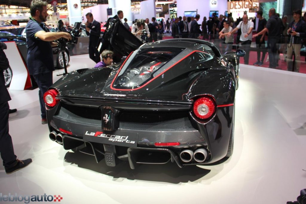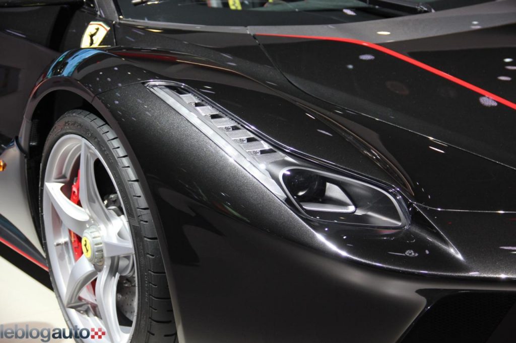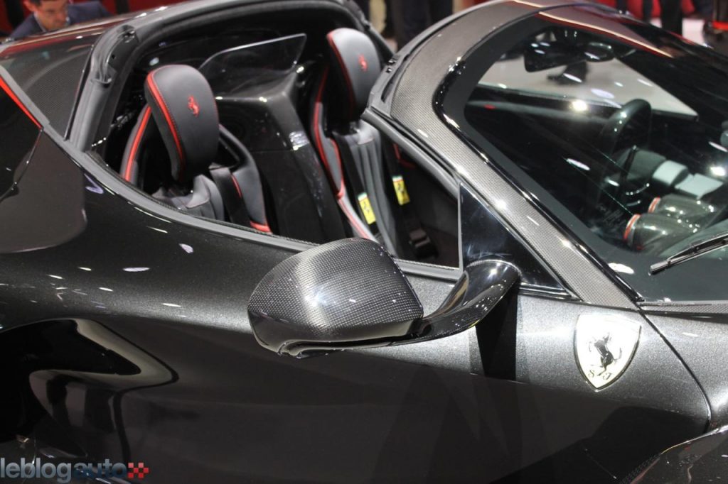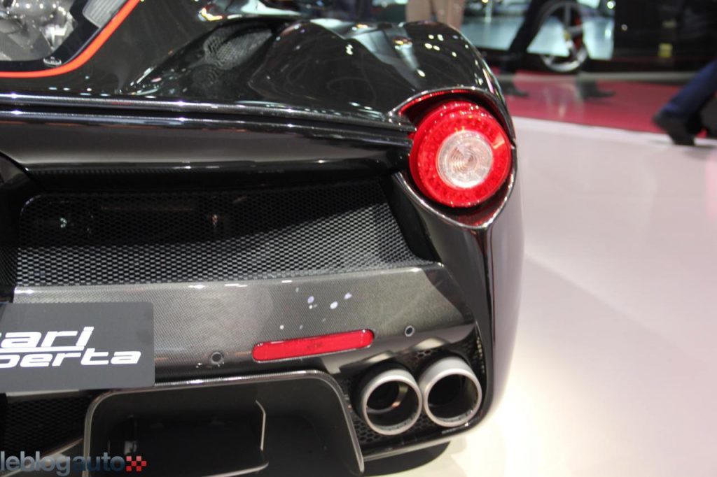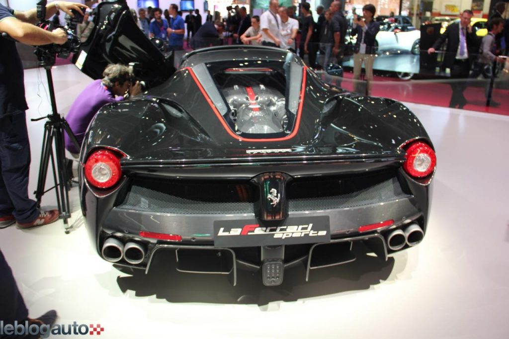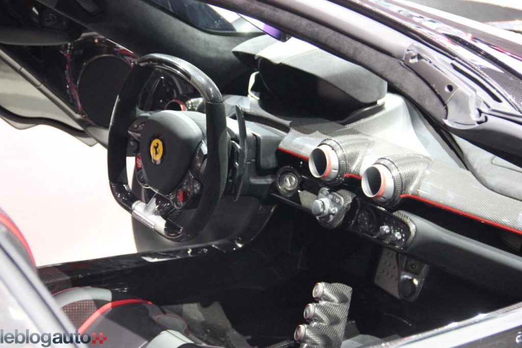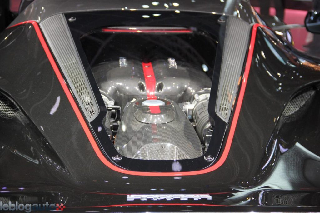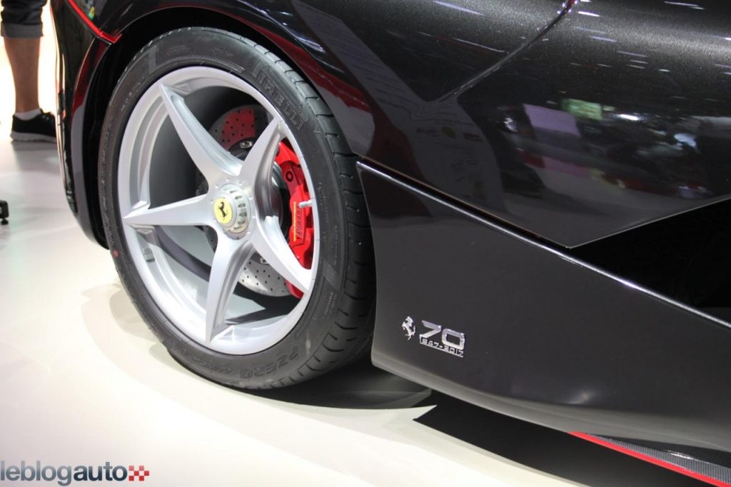 A l’intérieur, c’est du même acabit avec une profusion de carbone, de cuir et d’Alcantara. Des touches de rouge parsèment la voiture. Célébrant le 70 ème anniversaire de Ferrari, elle arbore un blason spécifique sur le bas des ailes arrières. A défaut de pouvoir l’entendre à la Porte de Versailles, le V12 6,3 litres atmosphérique de 800 ch associé à un système hybride de type KERS se laisse entrevoir par la baie moteur. Le tout développe 963 ch pour bien aérer le cuir chevelu.