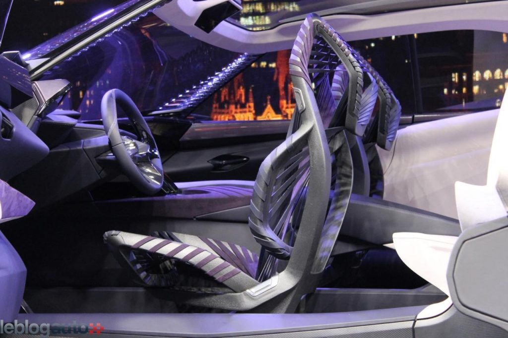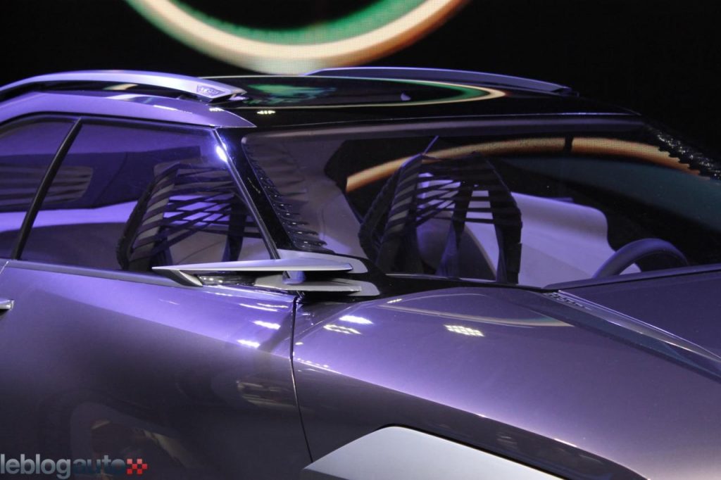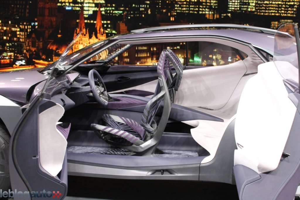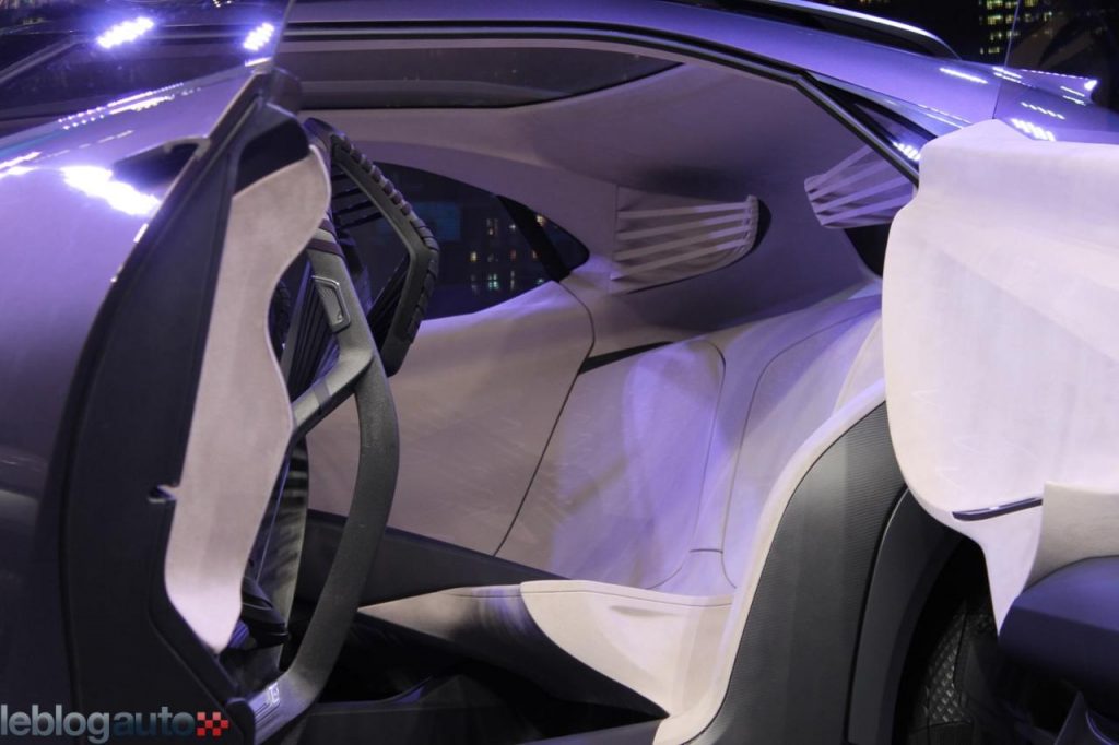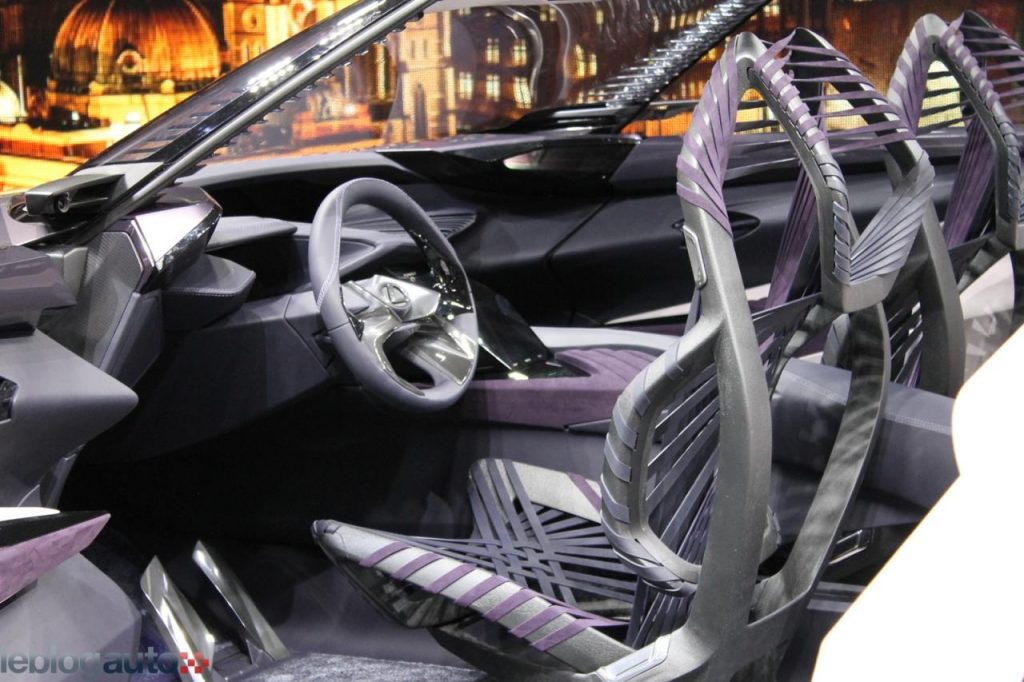 Les portières s’ouvrent en opposition et le véhicule n’a pas de pied milieu. Cela dégage un grand accès à l’intérieur. Ce dernier est composé de « sièges squelettes » qui accueillent les passagers sur des sangles tendues. La planche de bord arbore elle aussi un dessin torturé et on peut remarquer que Lexus remplace les rétroviseurs extérieurs par des caméras. Des écrans, sans doute placés de par et d’autre de la planche de bord, en relaieront les images pour le conducteur.