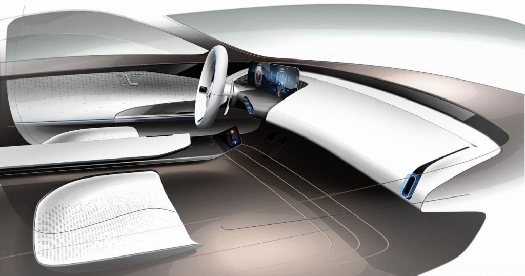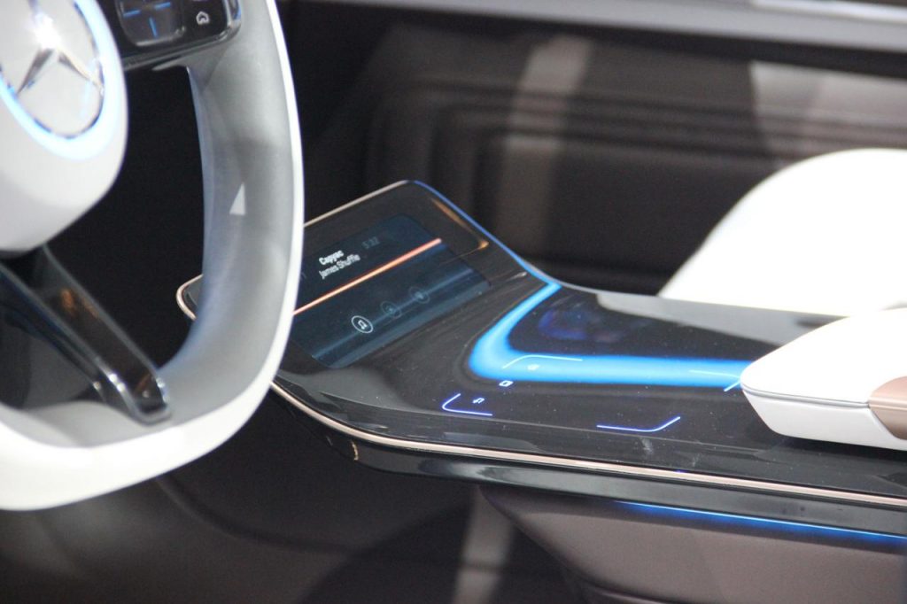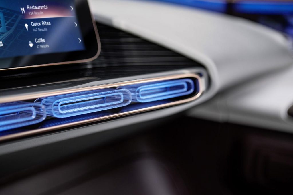 Le style intérieur devrait lui aussi donner des indications sur l’avenir de ces modèles. Avec ici un espace enveloppant autour des occupants des places avant via la continuité portes / planche en arc de cercle. L’instrumentation reprend le principe du double écran en mode panoramique des Classe E et S, ici avec un unique écran de 24 pouces. Mais en sustentation à la façon des écrans des plus petits modèles A / B / C… Un effet accentué par la perte de la continuité entre la console et la planche suspendue.