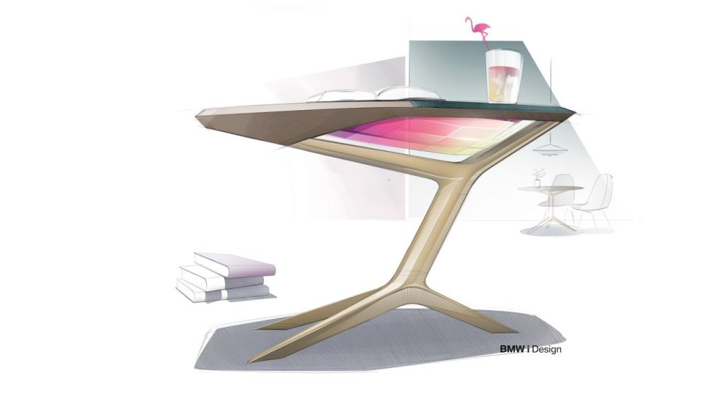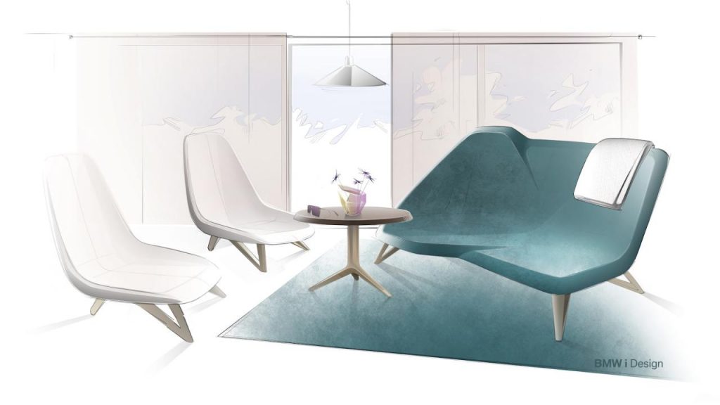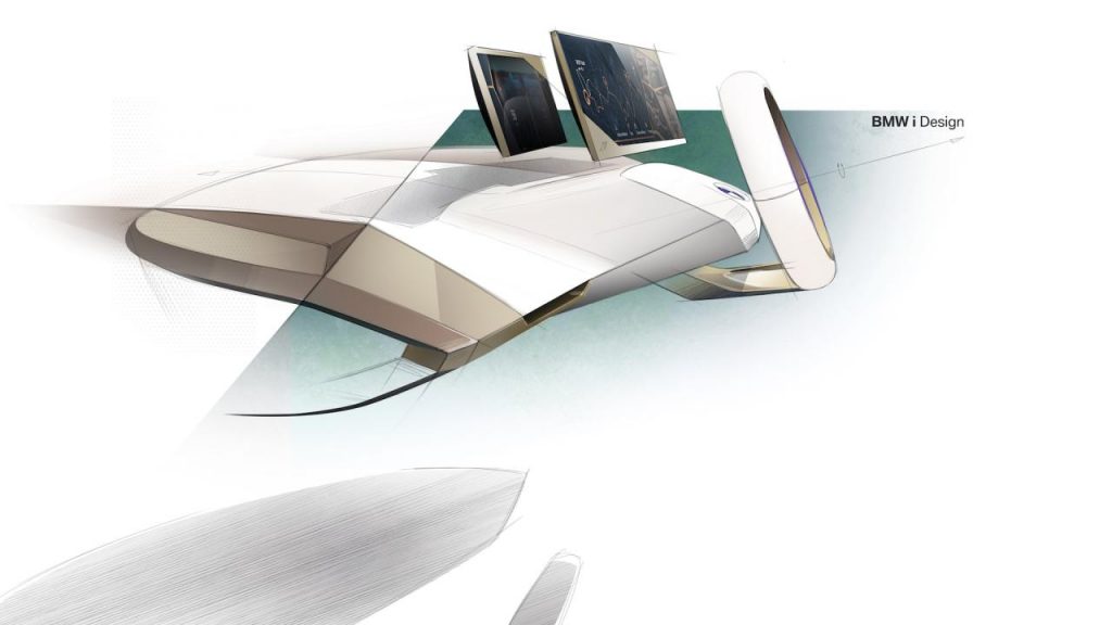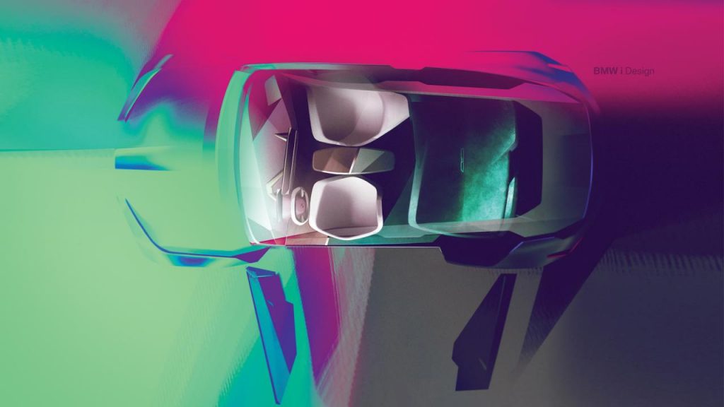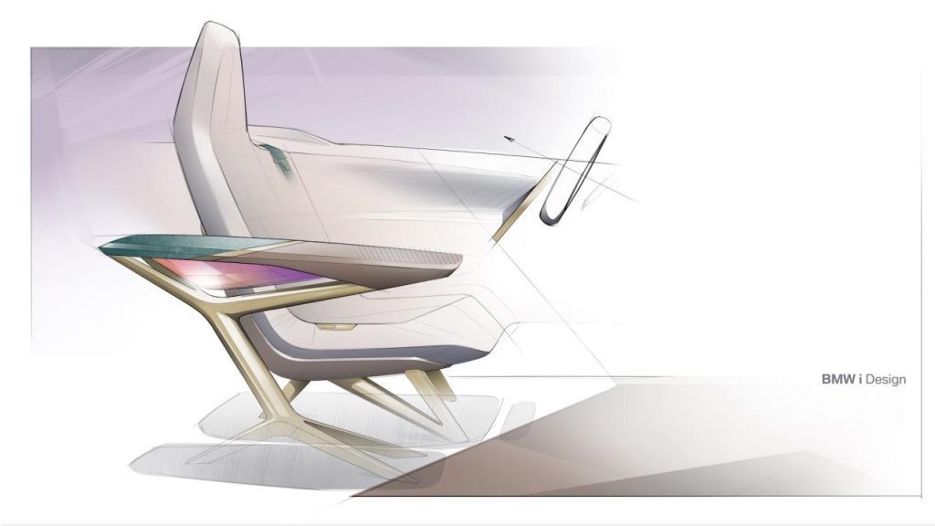 Les deux sièges avant sont séparés par une console centrale au dessin proche d’une table basse qui s’étire jusqu’aux places arrière. Celles-ci prennent la forme d’une banquette ou plutôt un canapé suffisamment large pour pouvoir accueillir jusqu’à quatre passagers selon BMW.