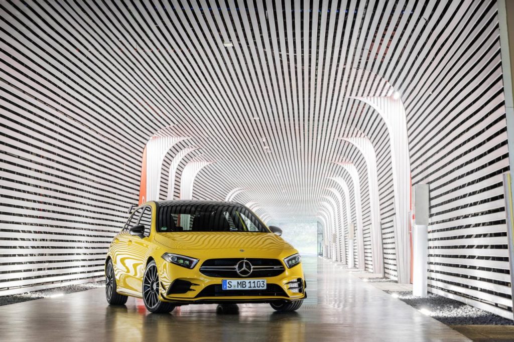 Superbe A200 Turbo. Ah non pardon aux personnes du marketing , c est une 35 Amg , pour moi c est toujours un 4cyl 2l beaucoup trop compressé. Un peu style norauto comme la précédente version. J adore le jaune de la carrosserie sur les montants des portes, une voiture à plus de 50000 euros, un habillage en plastique aurait été plus élégant