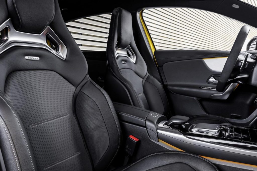 Dans l’habitacle, l’A35 reçoit des sièges baquets spécifiques drapés d’une sellerie similicuir/microfibre. L’ambiance sombre est rehaussée par des inserts en métal brossé et une ambiance lumineuse jaune. L’instrumentation est de type numérique avec un graphisme exclusif aux modèles AMG. Les amateurs de circuit pourront analyser leurs exploits avec l’enregistreur de données Track Pace AMG. Enfin, le volant est à méplat.