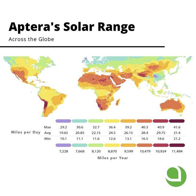 Aptera met à disposition un tableau pour estimer les kilomètres solaires que vous pouvez espérer récupérer (voir galerie photos). Dans certaines zones d’Afrique, des USA, du Canada ou de l’Australie, Aptera indique de 16,5 à 40,3 miles solaires par jour avec une moyenne de 28,4 miles soit de 26 à 65 km pour une moyenne de 46 km. Selon les données de consommation 6,25 kWh/100 km, 46 km représentent 2,9 kWh.