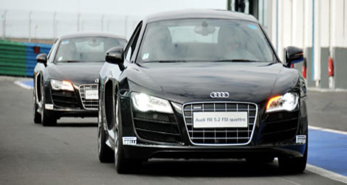 Un journaliste de la concurrence vient de partir pour ses quatre tours de pistes. Quatre tours qui semblent une éternité quand on attend pour une expérience comme celle-ci. Enfin, les rangées de diodes apparaissent au bout de la ligne des stands. Bientôt, je ne parlerai plus de la R8 mais de ma R8… C’est à la fois partagé entre l’excitation de piloter une auto exceptionnelle mais également l’appréhension due à la méconnaissance de cette dernière comme du circuit que je prends place à bord.
