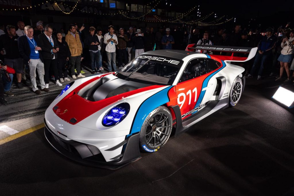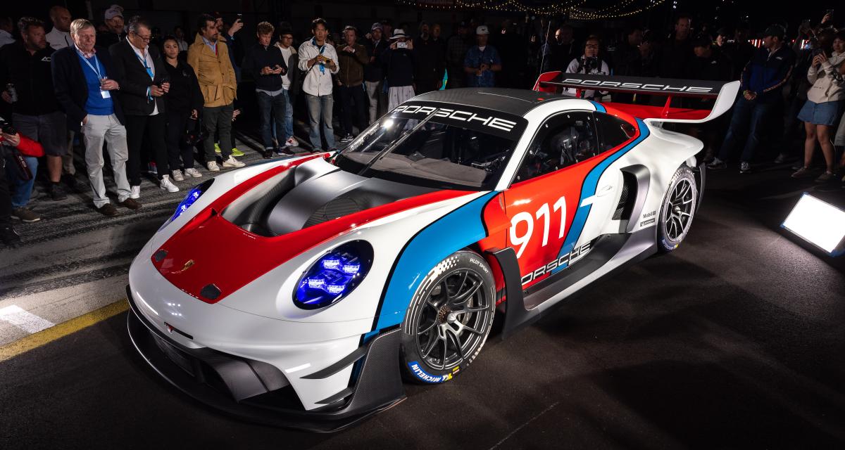 La partie la plus spectaculaire se trouve à l’arrière, avec un énorme aileron dont le design rappelle celui de laPorsche 935/77 Brumos, avec laquelle l'Américain Peter Gregg, avec le Néerlandais Toine Hezemans et l'Allemand Rolf Stommelen, ont remporté la septième victoire au classement général d'une Porsche aux 24 Heures de Daytona en 1978. Une barre lumineuse composée de fines bandes LED, qui intègrent désormais les lettres lumineuses du lettrage Porsche, caractérise la partie arrière globalement plus large. Le carénage arrière largement ouvert supprime les caches de calandre et les panneaux pour gagner du poids. Cela permet d'avoir une vue claire des composants techniques derrière et du système d'échappement.