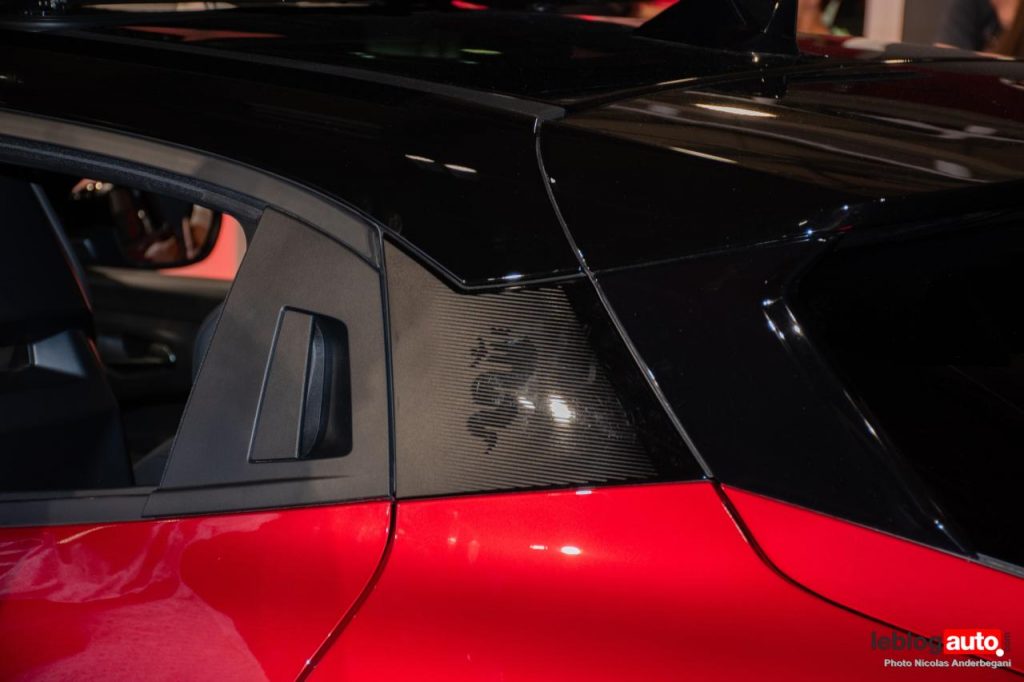 L’avant est la partie qui a été la plus clivante dans les réactions. En rupture avec le design des modèles précédents (ne serait-ce qu’avec le Tonale, sans même parler de l‘époque Giulia/Stelvio) la gueule de ce junior est assez chargée mais fait finalement moins massive que sur les photos. Le profil reste plutôt pointu, tourné vers le Scudetto, au look modernisé (sauf si l’on choisit la calandre rétro Leggenda), qui demeure, bien que plus petit pour intégrer la plaque au centre, le pivot fondamental du visage Alfa Romeo.