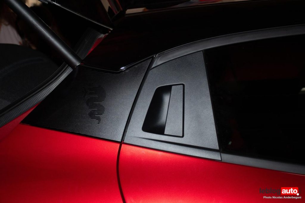 C’est d’ailleurs de profil qu’il plaira le plus, avec une ligne fuyante façon coda tronca – hommage assumé aux Zagato – une découpe du hayon autour de la vitre originale et une forme en béquet qui appuie sur la sportivité.