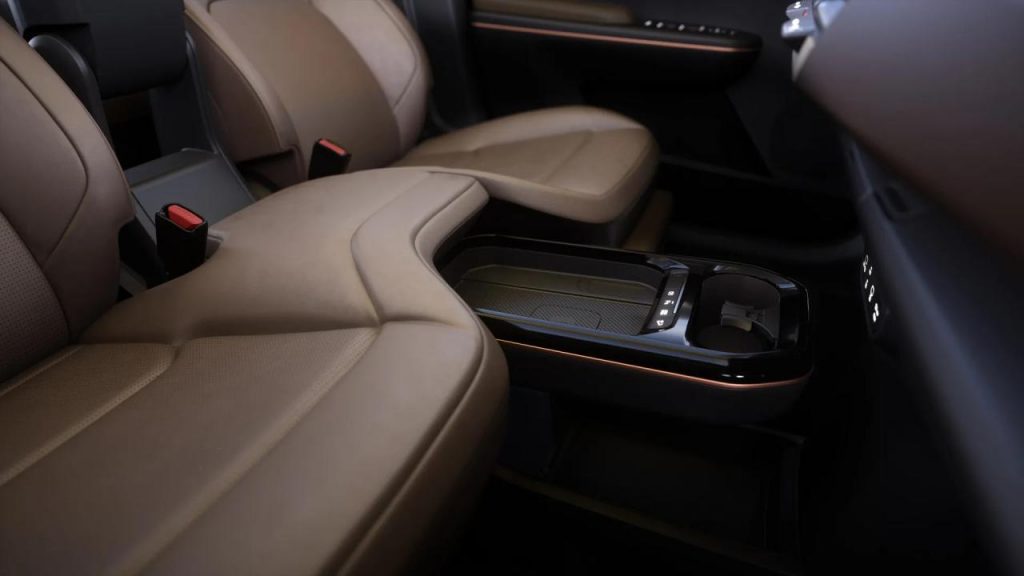 Sobre, pensé pour être érgonomique et pratique, l’intérieur du SUV a été imaginé selon la marque comme une « pièce supplémentaire » pour les foyers. La particularité vient du siège du passager avant qui s'étend au-dessus du tunnel central, le faisant ressembler davantage à un canapé. L'éclairage d'ambiance de 64 couleurs à luminosité réglable est synchronisé avec les modes de conduite et les alertes ADAS. Le tableau de bord de l'EV5 présente une disposition similaire à celle de l'EV9, concentré autour d'un seul panneau avec deux affichages pour le groupe d'instruments et l'infodivertissement. Le volant à quatre branches intègre la plupart des commandes, tandis que Kia a opté pour des boutons physiques pour la climatisation. Nous pouvons également voir deux ports USB-C, un chargeur sans fil, des porte-gobelets et des compartiments de rangement. La banquette arrière se replie à plat tandis que l'espace de chargement comporte des cloisons pratiques et un espace de rangement supplémentaire sous le plancher.