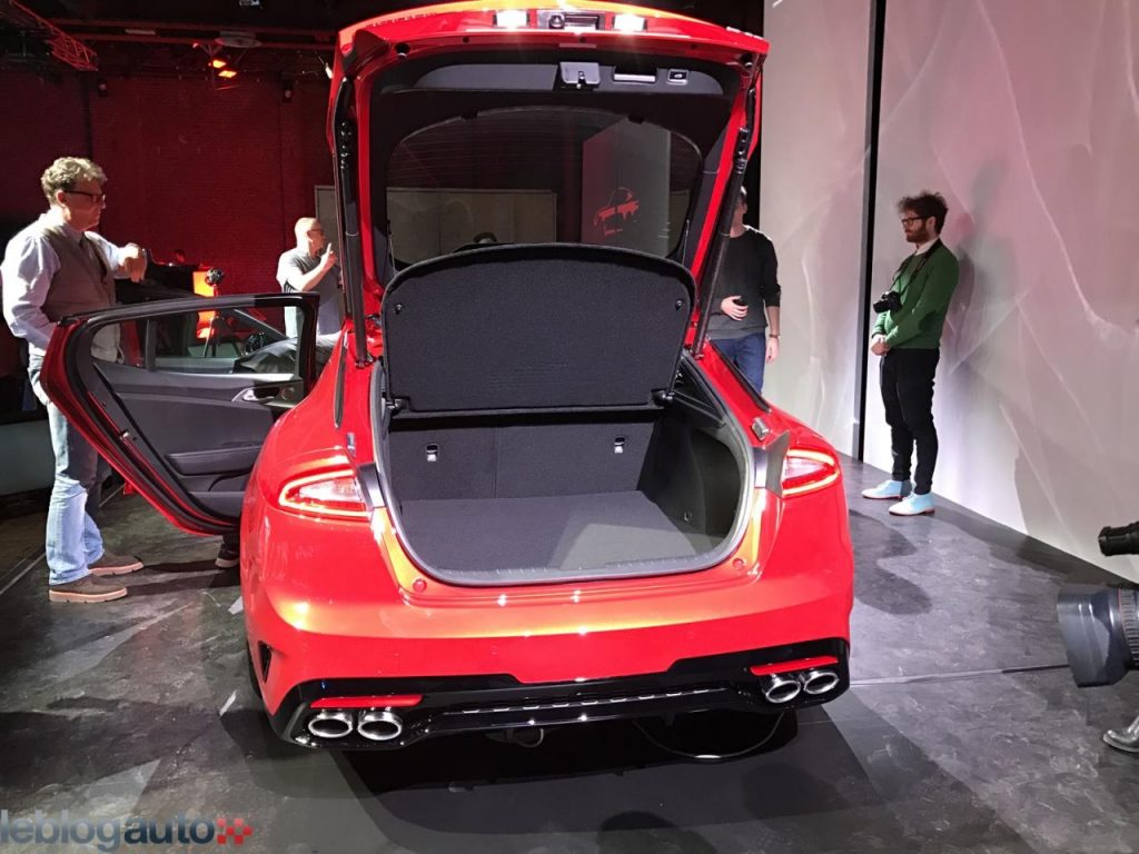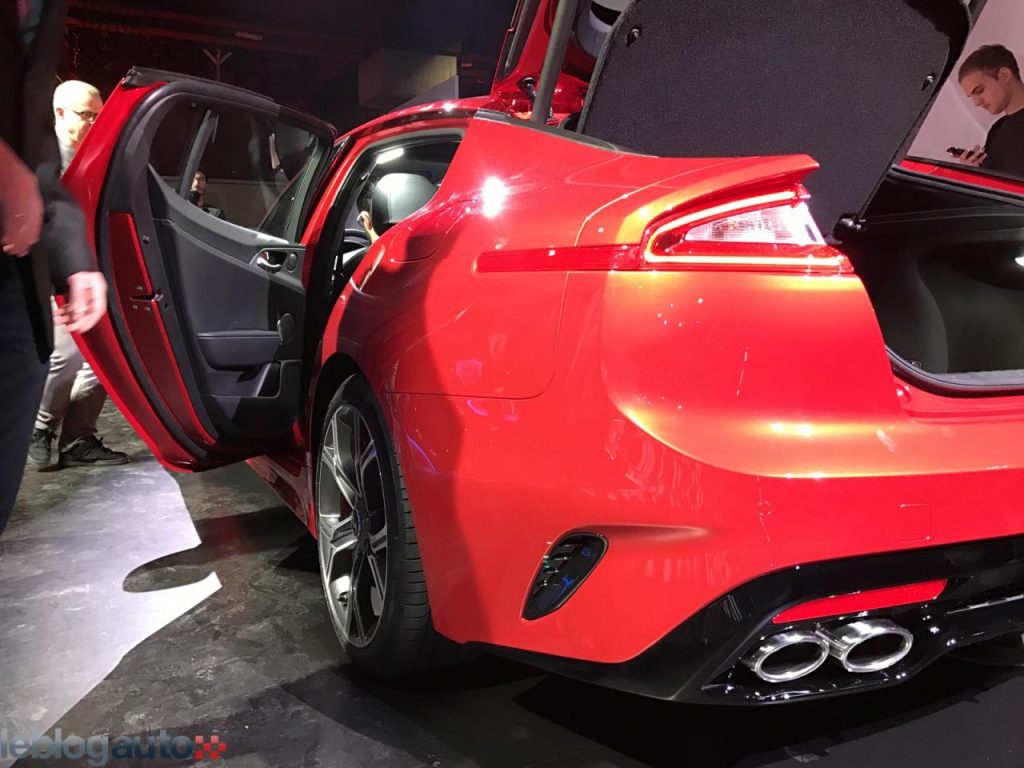 Sous le capot, un 4 cylindres turbo ou un 6 cylindres biturbo essence seront accompagnés par 4 cylindres diesel CRDI (présenté à Genève). Côté plumage, entre les prises d’air à l’avant, sur le capot, et le béquet de coffre ainsi que les 4 sorties d’échappement ovales, cette Kia Stinger ne fait pas vraiment dans la discrétion. Surtout avec cette teinte de carrosserie.
