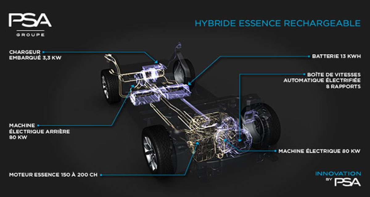 PSA annonce une batterie de 12 kWh pour les berlines, et 13 pour les SUV, pour une autonomie de 60 km en mode électrique. Le moteur thermique ira de de 150 à 200 ch selon les modèles, et des moteurs électriques de 80 kW chacun.