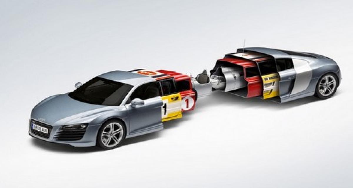 Sauf erreur, il s’agit (en partant du centre) d’une DKW F5, d’une Auto Union type C, d’une NSU TTS, d’une Audi Quattro A2 et donc, d’une Audi R8.