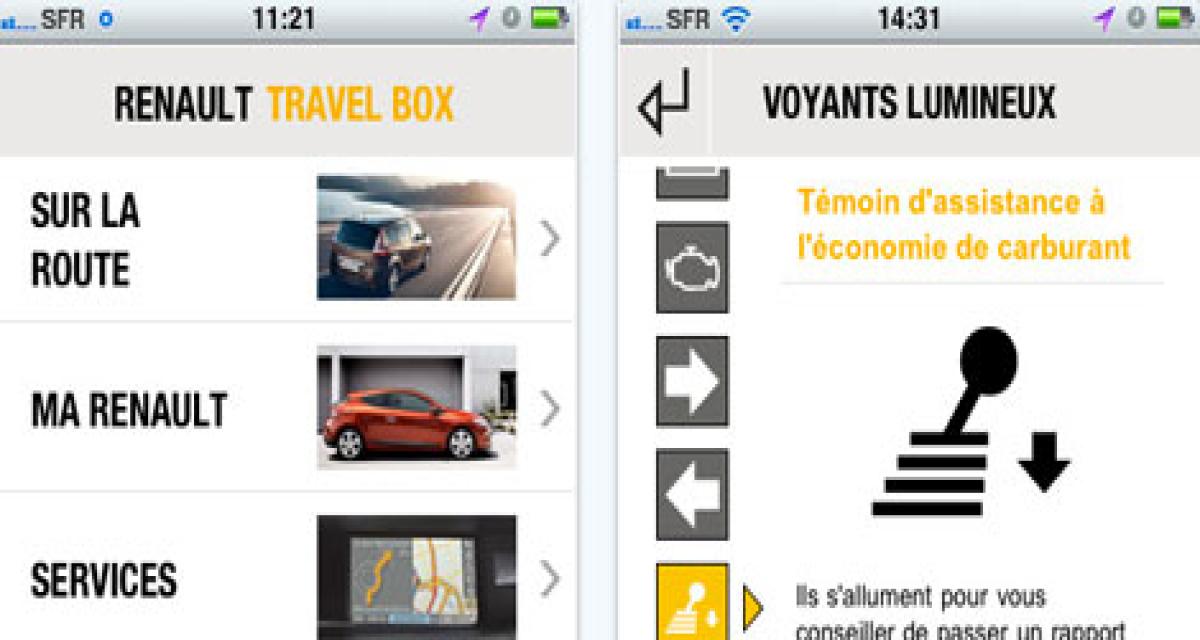 Dans la section « Ma Renault », il remplace le livret explicatif de la voiture avec le type d’huile moteur préconisé pour chaque modèle, la pression conseillées des pneumatiques et l’identification des voyants du tableau de bord.