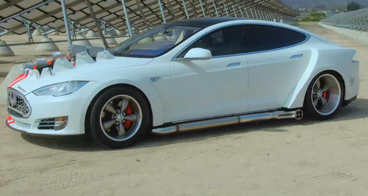 Il faut regarder l’emission c’est une Model S sur laquelle ont été retiré Batterie et moteur électrique, le moteur est rentré au chausse pieds en défoncant le frunk et en mettant en place un arbre de transmission et des cardans aux roues arrière. Donc en gros chassis, caisse, intérieur de Tesla.