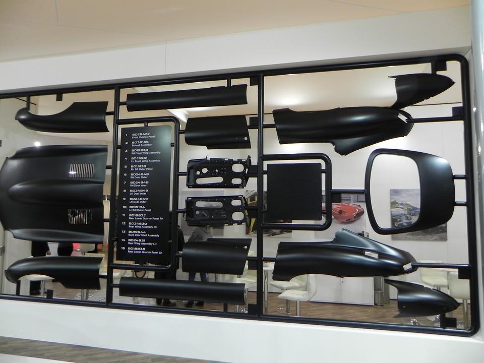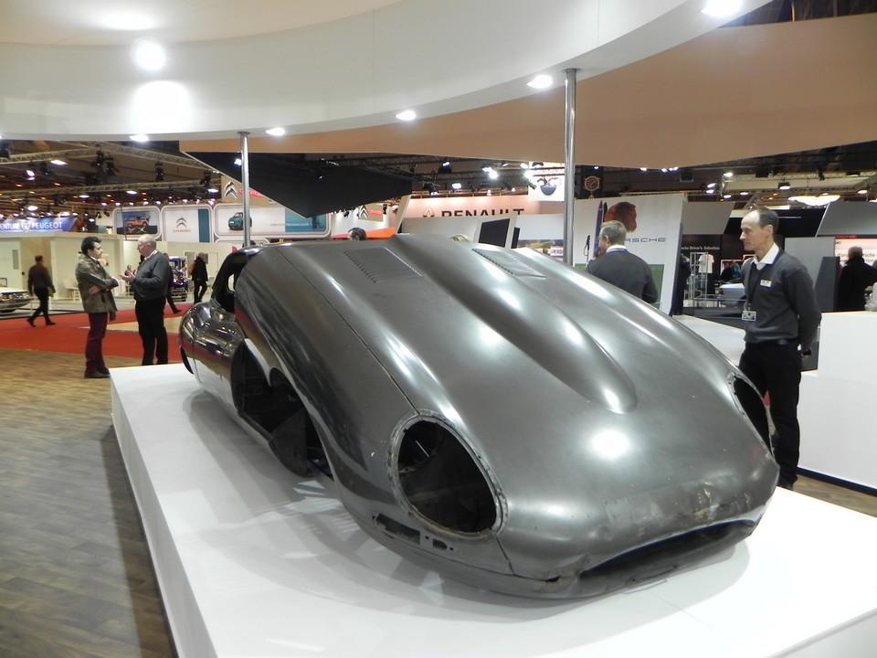 Officiellement, Jaguar-Land Rover est là pour présenter le savoir-faire de SVO (Special Vehicle Operations), son service interne de restauration et de commercialisation de pièces anciennes. D’où le mur de panneaux de carrosseries de Type E façon maquette (qui rappelle également un décor de Top Gear.)
