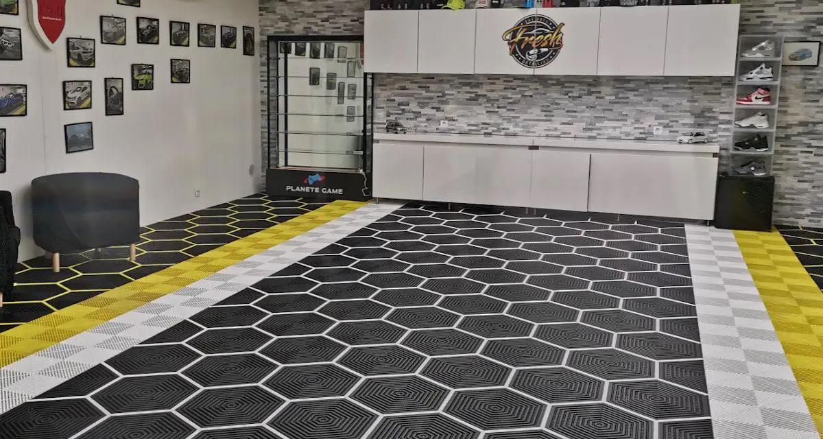 La plupart des dalles de garage du marché sont carrées et se clipsent aisément. Mais, il existe des fabricants qui proposent par exemple des dalles hexagonales que l’on peut habiller avec des bords colorés assortis, ou non, à son bolide. On peut même les prendre « pleines » avec un effet « grain de riz » par exemple.