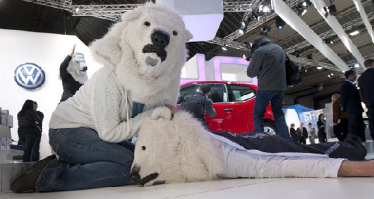 Quelques dizaines de manifestants déguisés en ours polaires se sont ainsi couchés au sol ou sur les véhicules pour symboliser la mort de cette espèce si l’on n’accélère pas notre prise de distance par rapport au pétrole, certaines compagnies prévoyant déjà d’extraire les derniers gisements situés dans des régions reculées de l’Arctique.