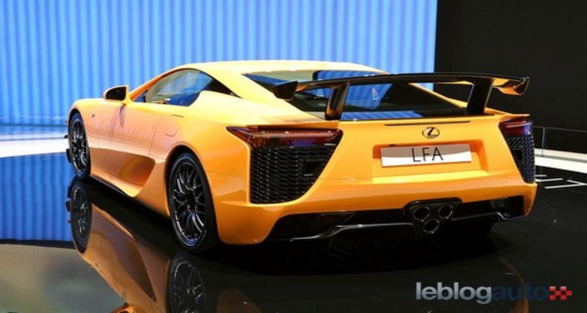 Chaque rare client se verra octroyer un pass d’un an et une formation sur le célèbre circuit allemand. Elle sera disponible dans la seconde moitié de l’année 2012 et de nombreux ajouts techniques comme esthétiques la distingue de la LFA « classique ». Entre autre, une lame de spoiler avant, des déflecteurs d’air latéraux et un aileron arrière tout cela en carbone. De nouvelles jantes et un abaissement de caisse viennent couronner le tout. Inutile d’en rajouter puisque tout a déjà été dit à son sujet mais comme on dit quand on aime on ne compte pas, si ce n’est le prix, 375 000 euros pour la version d’origine et il faudra compter entre 60 et 65 000 euros de plus pour cette version boostée.
