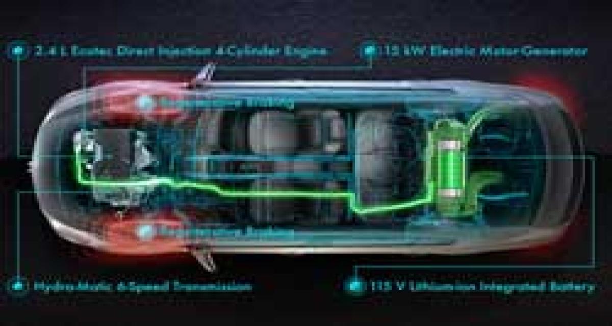 Pour la Lacrosse, GM n’utilise pas le terme d’hybride, mais plus modestement celui d’assistance, d’où l’appellation eAssist. Il est vrai que le moteur qui fait également office d’alternateur ne propose que 15 kW. Il entraîne le moteur via une courroie, selon un principe d’alterno démarreur. Il permet ainsi d’assurer les fonctions d’arrêt / redémarrage du moteur, celles d’alternateur pour recharger les batteries lithium-ion, et d’assistance au moteur thermique.