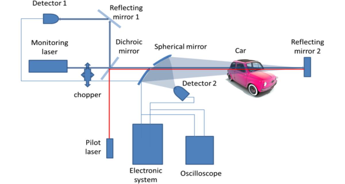 Ces trois chercheurs travaillent pour l’Institut Militaire de Varsovie (Pologne) et ont eu l’idée d’un moyen automatique de détecter l’alcool dans un habitacle. Le principe est relativement simple – la spectroscopie – et utilise un laser. Ce dernier est envoyé depuis le bord de la route, traverse l’habitacle et est réfléchit par un miroir posé de l’autre coté de la route. Il reprend le sens inverse (à la vitesse de la lumière évidemment et arrive sur un capteur.