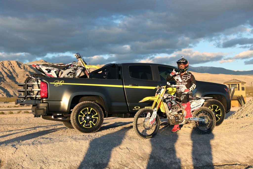 Animé par le V6 3.6 l de 305 ch, ce Chevrolet Colorado Performance Concept adopte une livrée de carrosserie gris mat qui se marie avec des pointes de jaune et de gris argenté. On note aussi un graphique avec la signature du pilote américain de motocross.