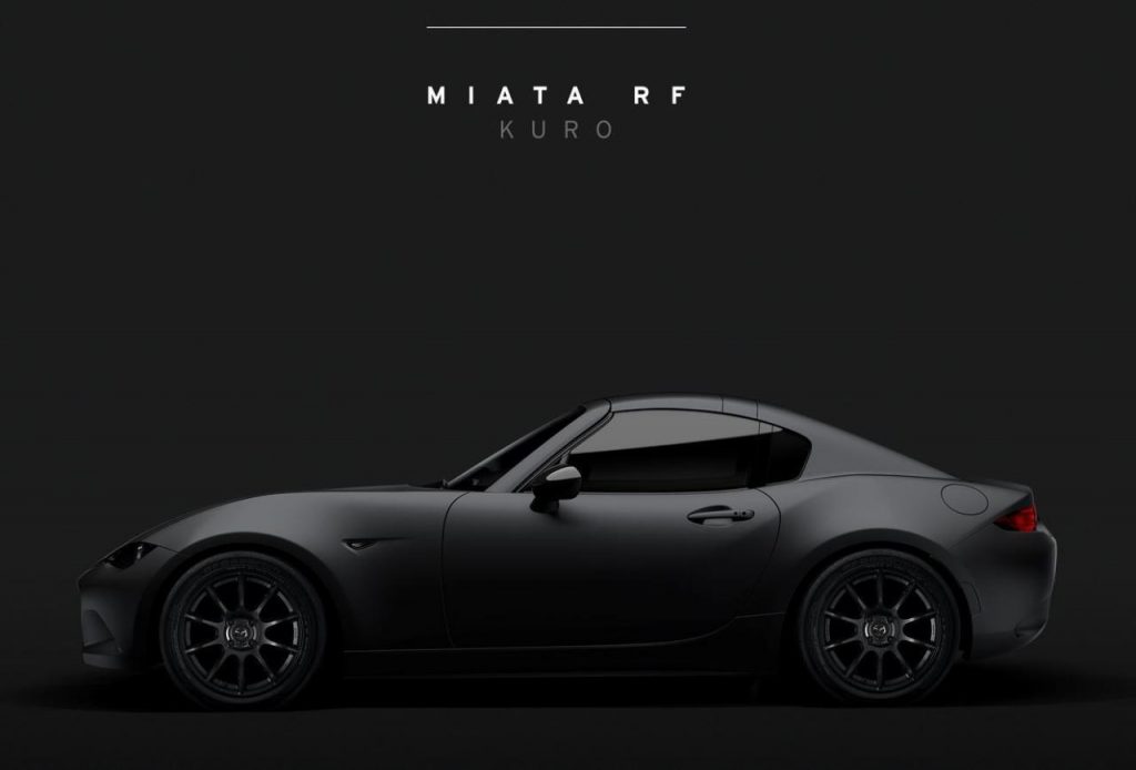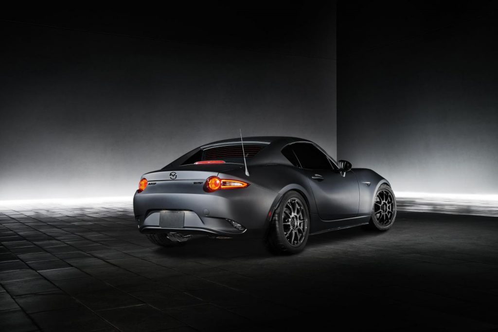 Le concept Mazda MX-5 RF Kuro, version cousine de la la MX-5 RF qui débute sa carrière, se laisse découvrir en parure ton noir métallisé. On peut aussi apprécier les caoutchoucs 215/45 G-Force de BF Goodrich ou les jantes.