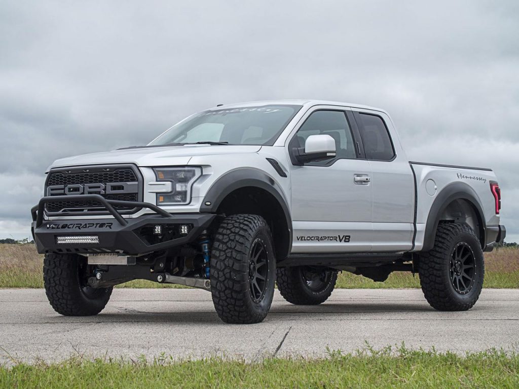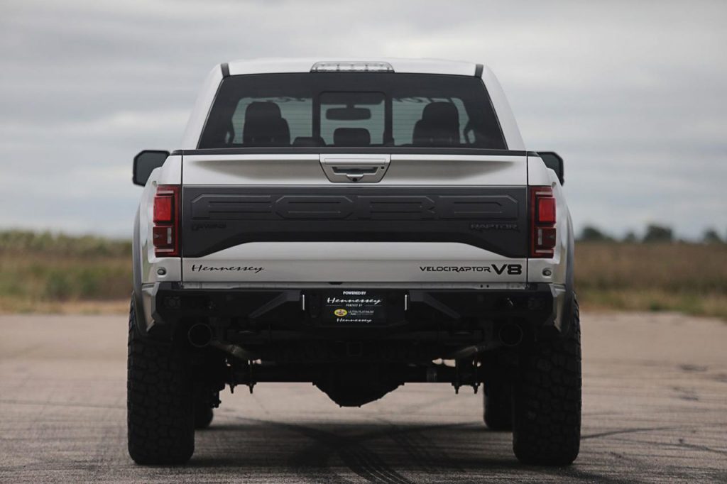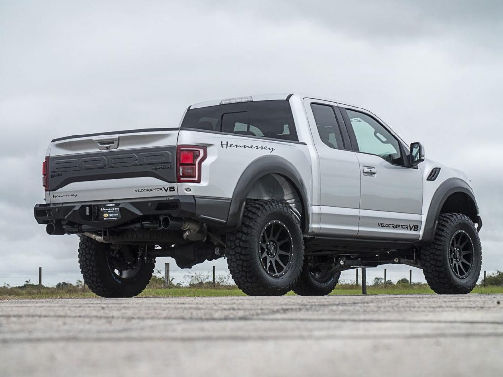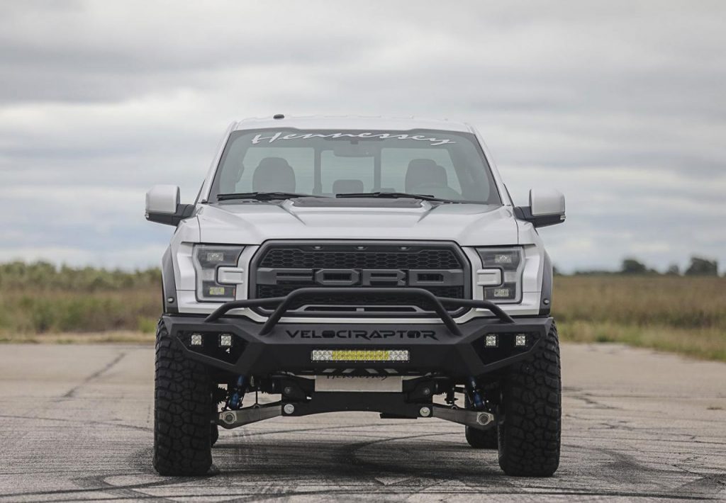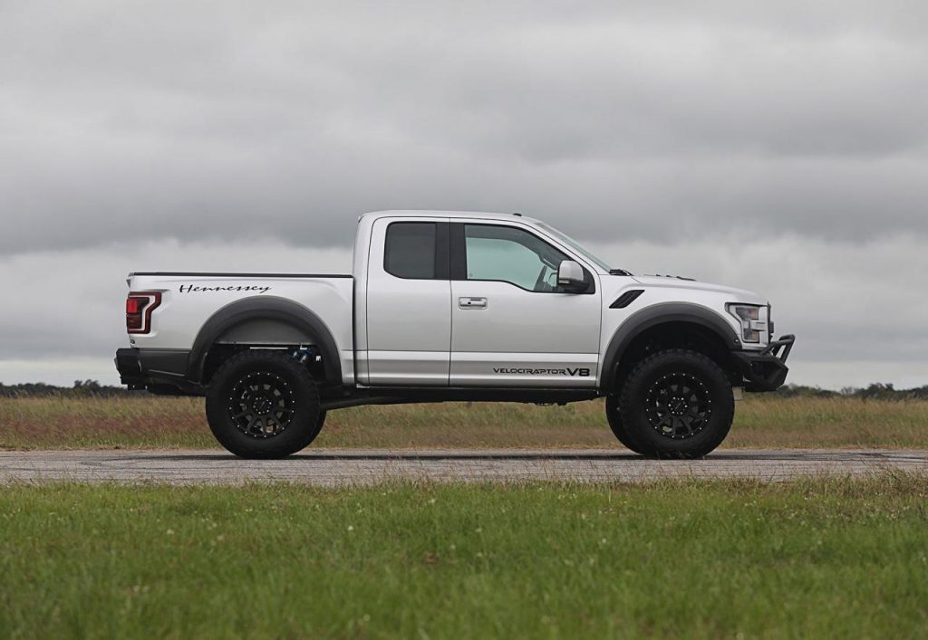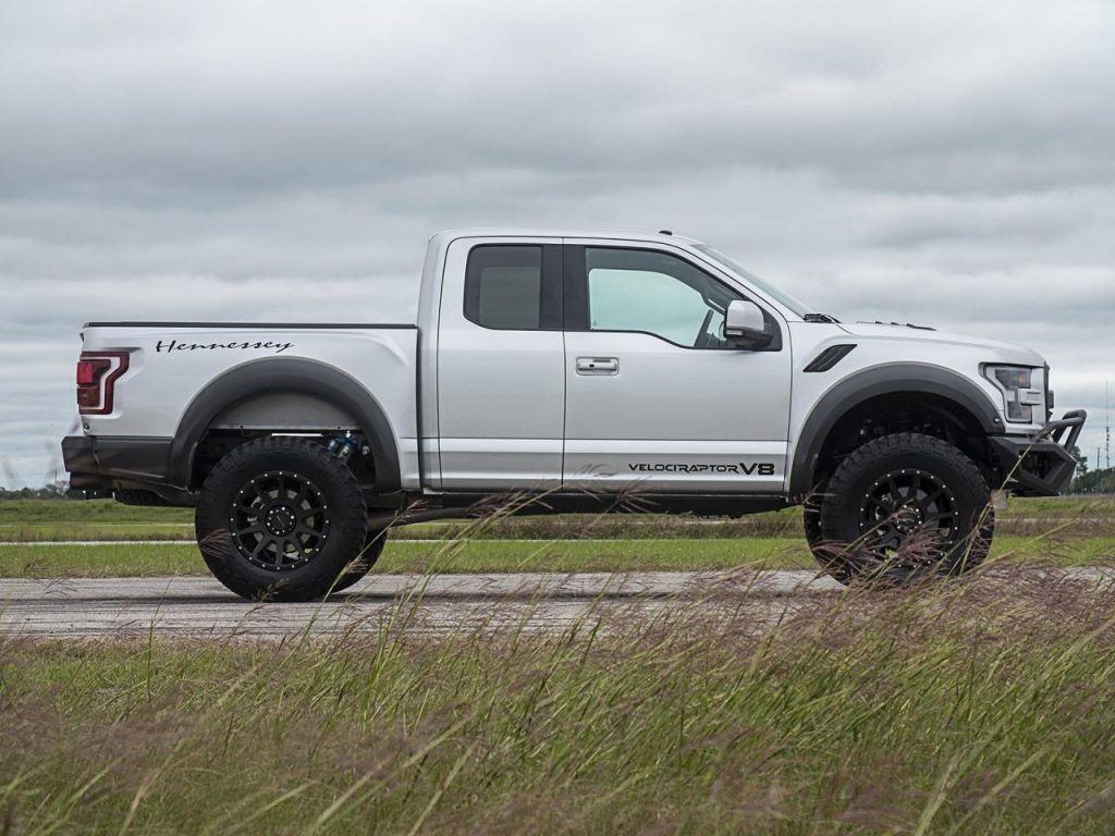 C’est donc bien un V8 que l’on retrouve désormais à bord du Raptor, pardon VelociRaptor une fois préparé par Hennessey. Le V8 Ford 5.0 Coyote a toute la place nécessaire sous le capot du pick-up, et pour faire bonne mesure il est lui aussi suralimenté et sa puissance grimpe à 769 ch. De quoi propulser cet étrange engin en seulement 4,1 s dans l’exercice du 0-60 mph (96 km/h), et en 12,2 s sur le quart de mile.