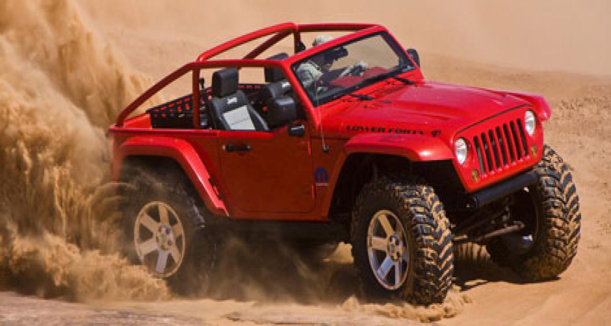 Le Jeep Lower Forty, créé par Mopar, entend pousser encore plus loin les capacités tout-terrain du Wrangler au moyen d’un intense préparation physique : immenses jantes (40″ avec les pneumatiques) imposant de rogner les ailes, pare brise raccourci et incliné, capot en fibre de carbone, arceau de sécurité renforcé, roue de secours relogée dans l’espace derrière les sièges, suspensions renforcées et différentiels spécifiques… Et surtout sous le capot le V8 HEMI 5.7.