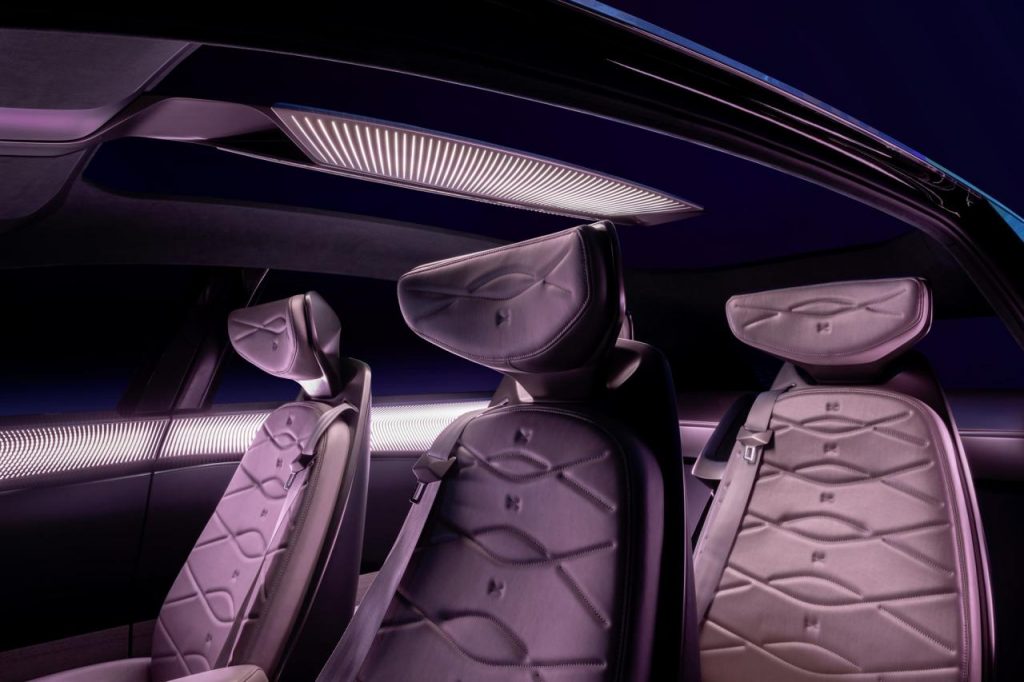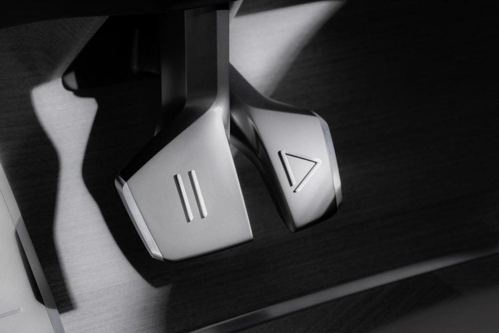 Comme on est dans le conceptuel, les portes s’ouvrent largement en glissant, vers l’avant à l’avant, vers l’arrière à l’arrière. Pas de pied milieu pour un accès très aisé. Les sièges peuvent pivoter jusqu’à 25° vers l’intérieur, en mode autonome, pour tenir salon. Les sièges sont en « AppleSkin », un revêtement renouvelable (*).
