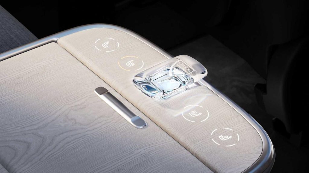 Une autre section en bois ci-dessous dispose d’un écran tactile intégré qui permet d'accéder facilement aux réglages de chauffage et de massage des sièges. Les passagers trouveront également un grand cristal Orrefors qui agit comme un interrupteur pour contrôler le diffuseur de parfum. Ce dernier émet trois parfums différents et "l'expérience sensorielle est amplifiée par un éclairage d'ambiance correspondant".