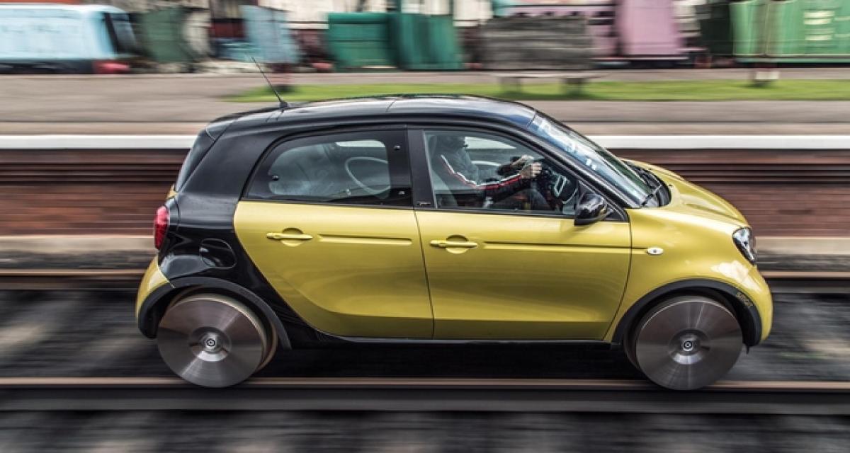La Forfour perd ses roues traditionnelles au profit de roues métalliques de 22 pouces lui permettant de rouler sur des rails.