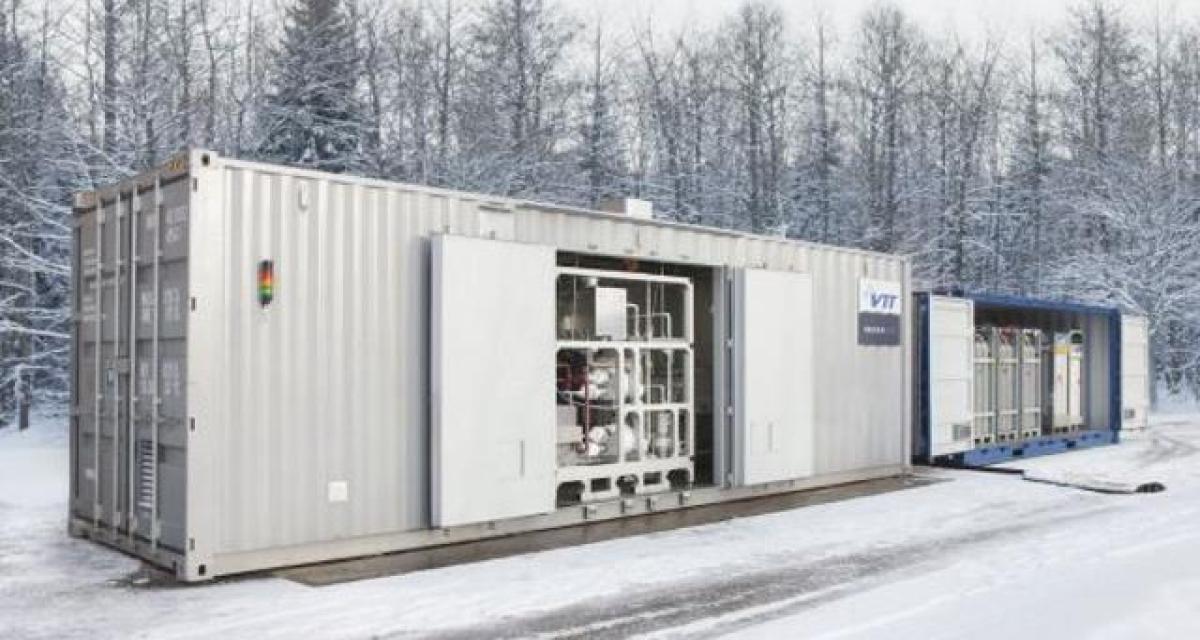 Pour produire le H2, VTT utilise une station photovoltaïque de 1500 m2 de panneaux (*). Cette dernière fournit aussi l’électricité nécessaire à l’équipement de captation et de séparation du CO2 de l’air, ainsi que la (haute) température pour l’équipement qui réalise la synthèse des hydrocarbures (300°C). Une première étape sort des produits qui sont utilisés dans une réaction dite de Fischer-Tropsch (produits FT). Là, ce sont 800°C qui sont nécessaires.