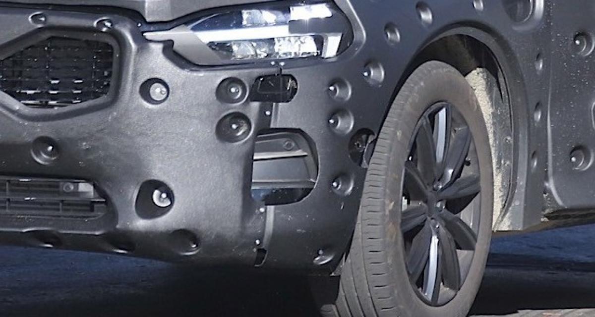 Toutes les proportions sont savamment escamotées et le design caché (les spyshots via ce lien). Perce toutefois quelque peu la face avant. De cette face avant, dans la lignée des produits du segment supérieur dont son grand fère XC90 en premier chef, on découvre la fameuse signature lumineuse et le marteau de Thor.