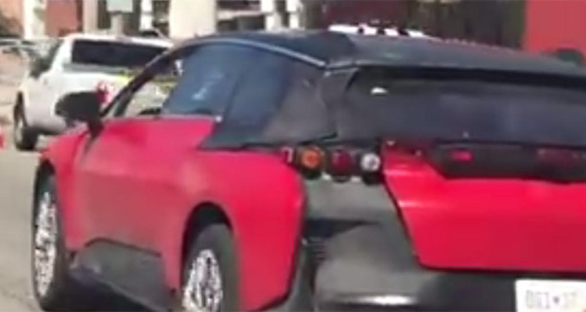Malgré les camouflages et les pièces de développement, on reconnaît ici la physionomie de la Faraday Future FF91. Dévoilée au dernier CES dans ce qui était censé être sa version « de série ». Ce grand crossover continue sa mise au point, en particulier en ce qui concerne on équipement de conduite autonome. On identifie d’ailleurs sur ce prototype un ensemble de capteurs sur le toit. Que l’on retrouve d’ailleurs sur la Tesla Model X qui précède.