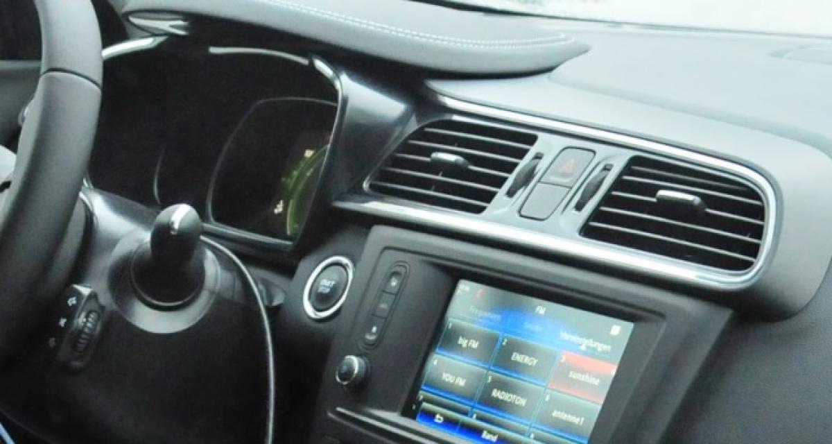 On y découvre une console centrale axée autour d’un grand écran tactile avec la partie climatisation (ici bi-zone) toujours en boutons, dessous. Au dessus de l’écran, les deux aérateurs sont visuellement rattachés à la partie compteurs. La partie basse de la console centrale semble très haute et enveloppante. L’intérieur arbore différents matériaux comme sur cette partie basse par exemple avec du cuir, des éléments finition métal, d’autres en finition piano (noir laqué). La casquette des compteurs est recouverte de cuir (ou d’un plastique imitant le cuir).