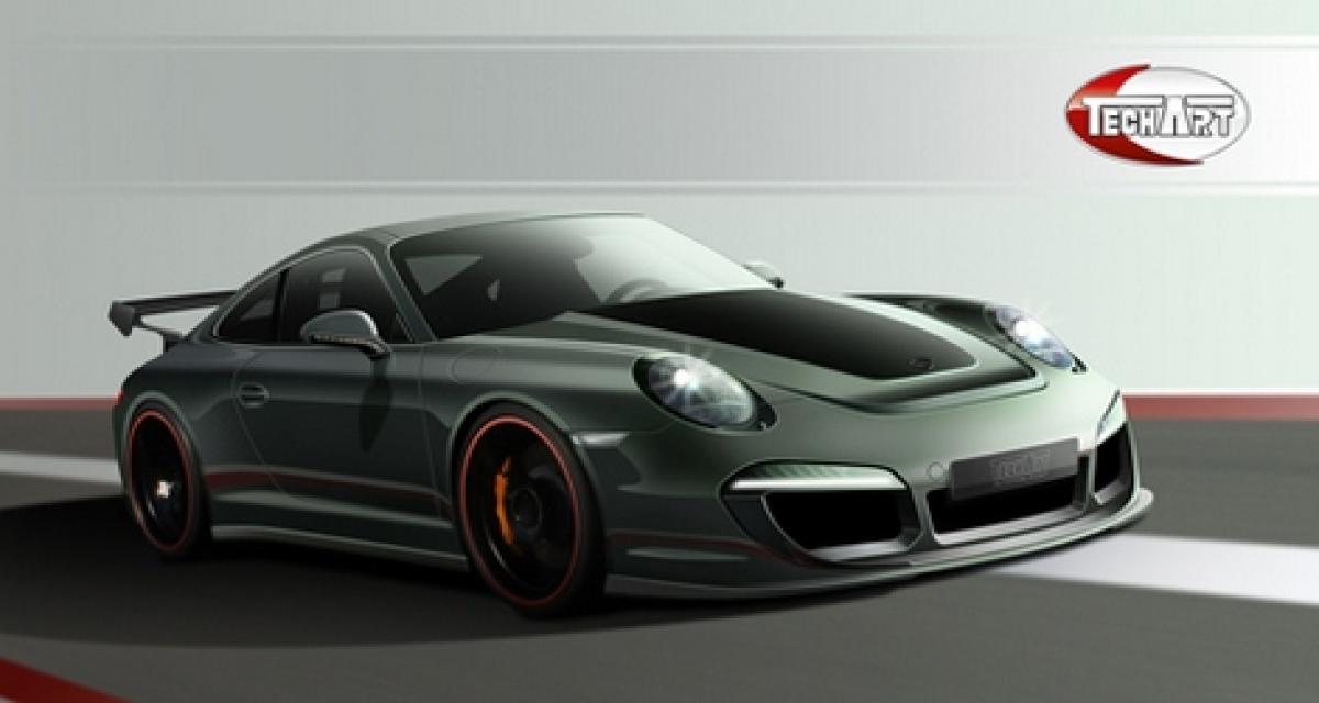 TechArt dégaine plus vite que son ombre ! Alors même que la nouvelle génération de la Porsche 911 n’a pas encore officiellement caressé les moquettes du salon de Francfort, le préparateur allemand avance déjà son programme pour le mythe de Zuffenhausen et publie cette seule illustration virtuelle.
