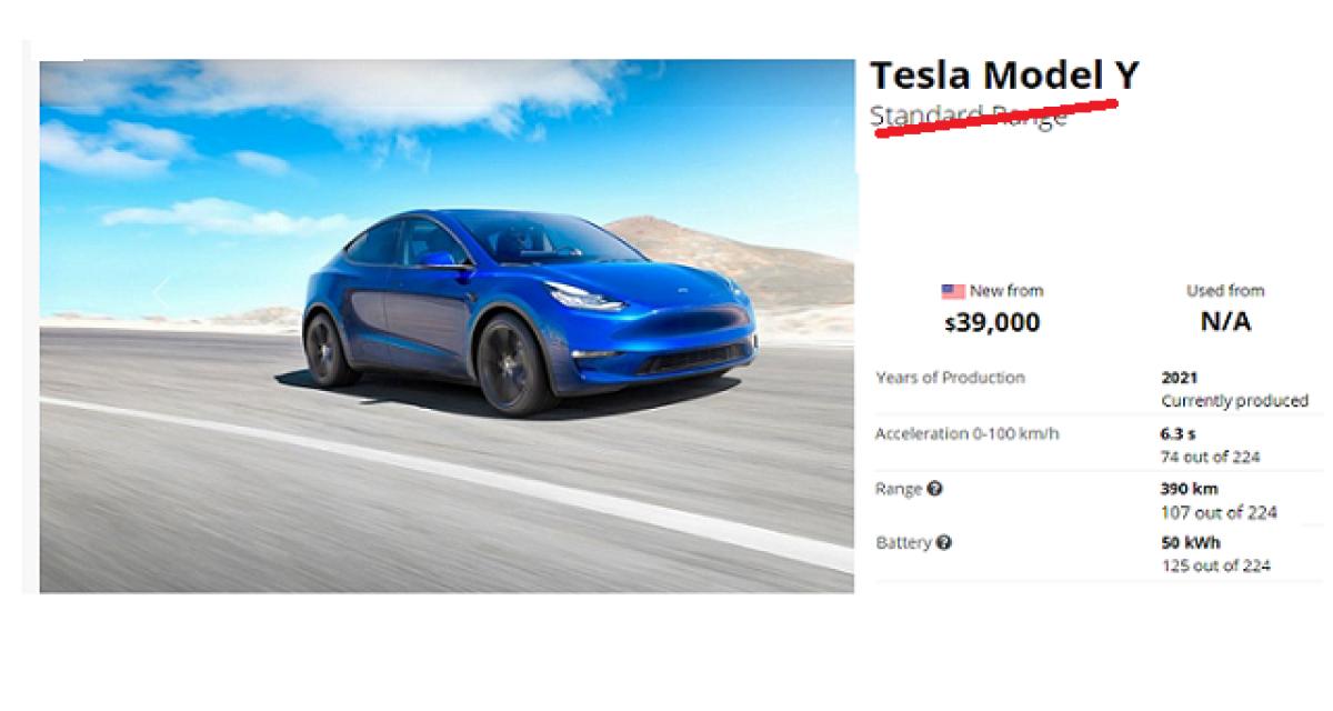 Musk a en effet indiqué sur Twitter que le Model Y Standard Range (Autonomie Standard) ne devrait pas voir pas le jour. Arguments invoqués : son autonomie, située sous la barre des 250 miles (402 km) est insuffisante à ses yeux.