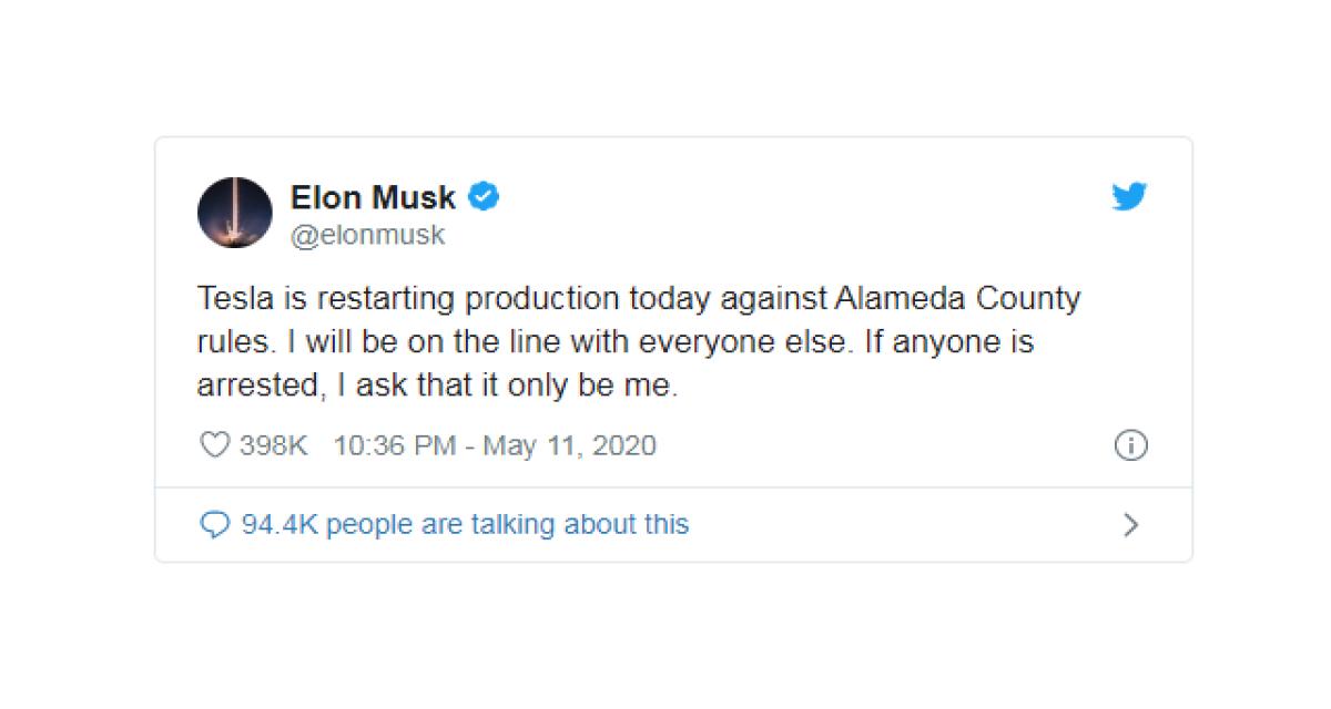 Même si je n’apprecie pas particulierement le personnage, on peut comprendre la logique de tout PDG/industriel… dans cette période compliquée. En faisant un gros résumé, pas de prod, pas de vente…. donc pas de sous, donc pas de salaire donc licenciement, mais cela vaut pour toutes les entreprises, pas que Tesla . Après, la vraie question est d’ordre « humaine » : l’homme vaut-il plus que le commerce, cela vaut-il le coup de « saccrifier » quelques directives pour refaire tourner l’economie… , chacun son opinion …. Musk a choisi, d’autres aussi