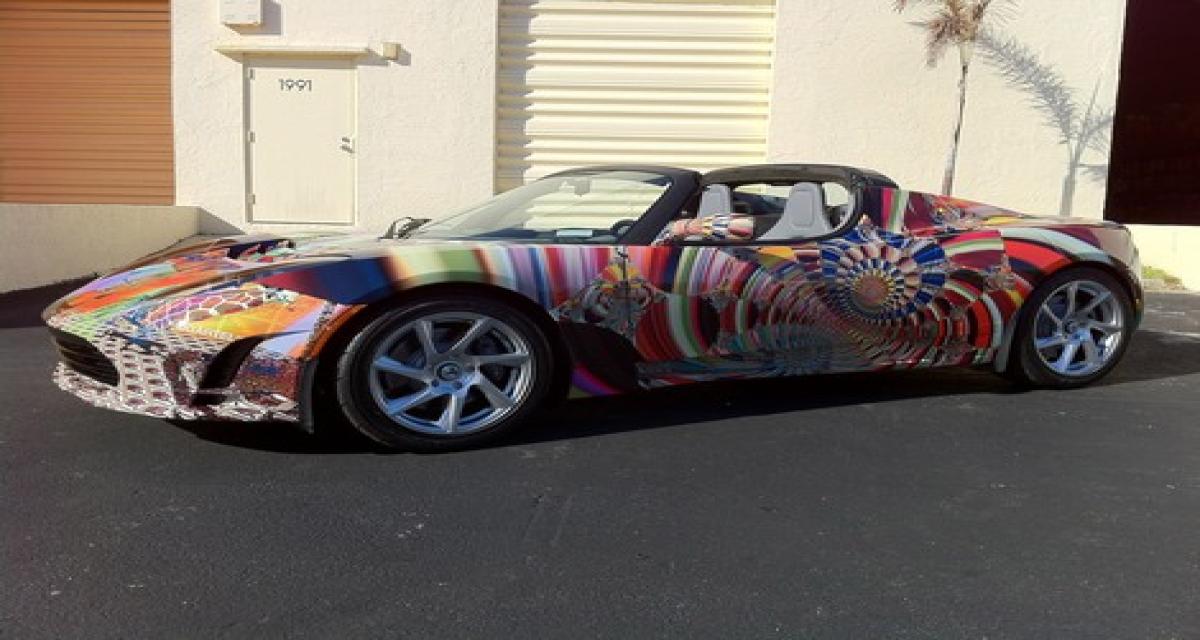 Dans une veine très BMW et ses fameuses Art Car (à l’instar de la dernière M3 GT2 signée Jeff Koons et découverte en live au Centre Georges Pompidou), voici un exemplaire artistique de la Tesla Roadster.