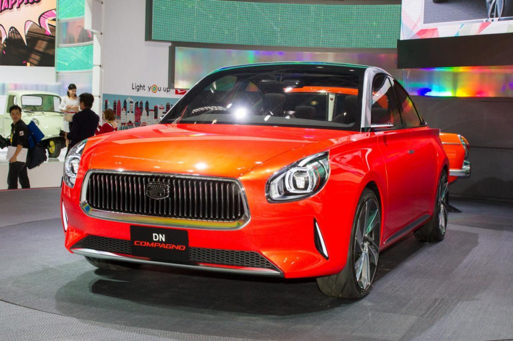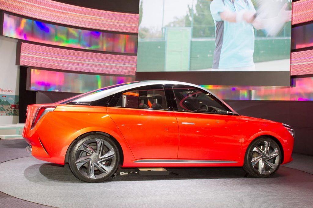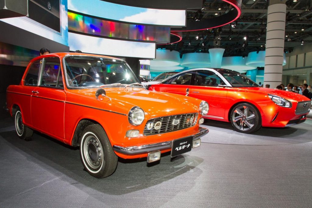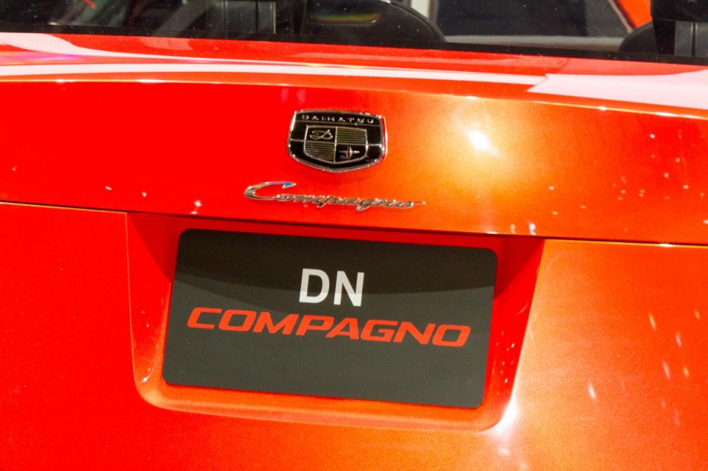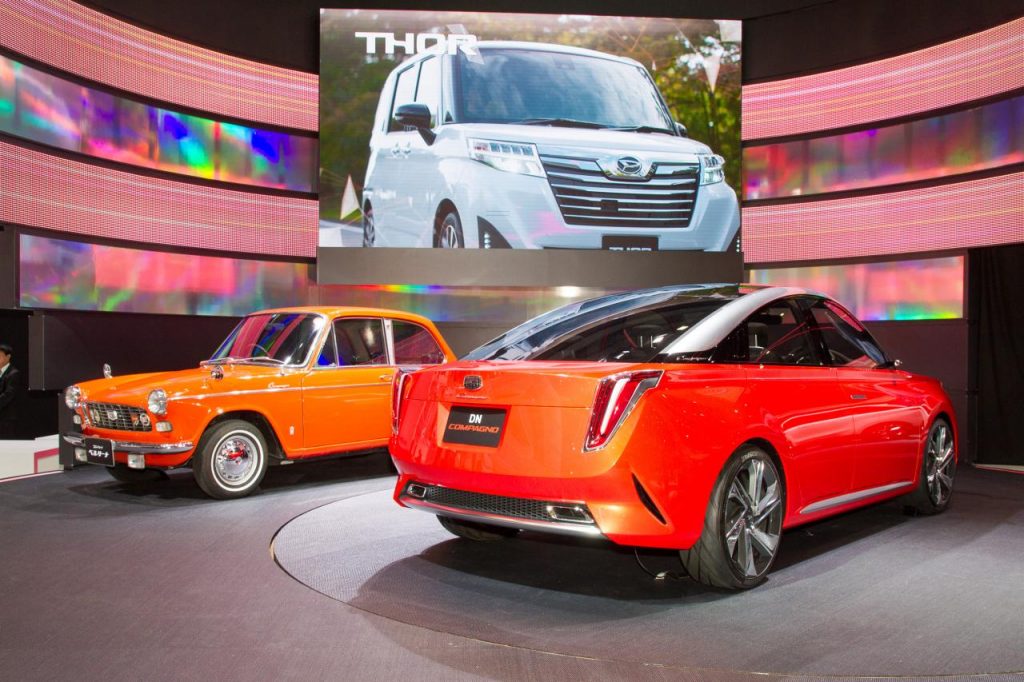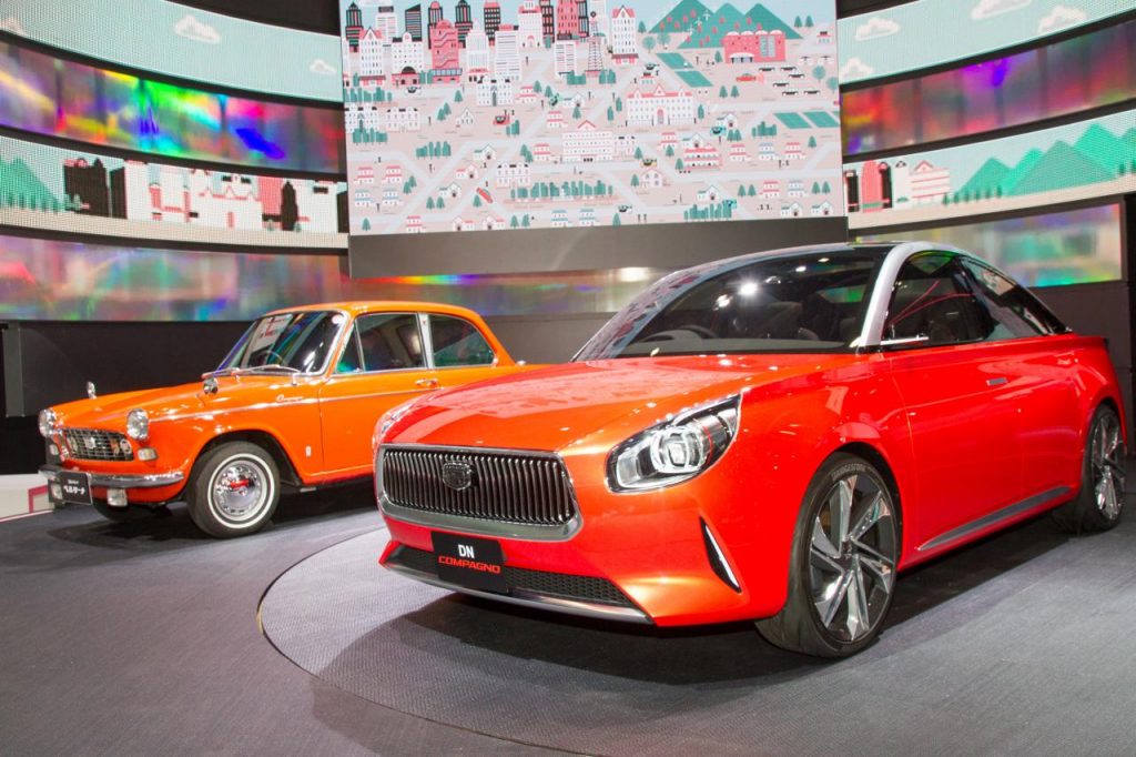 La petite berline n’est pas sans rappeler la Suzuki Regina/G70 aperçue à Tokyo en 2011. Et l’Autozam Revue alias Mazda 121 en 1990 relevait du même exercice. La Compagno est une voiture de petite taille–sans pour autant être une Kei-jidosha- originale et décalée. Le pouvoir de séduction est certain, on imagine la cible plutôt féminine.Comme nous avons pu le constater de visu, l’exercice de style est aussi réussi que séduisant. Et sur le stand, Daihatsu a eu la riche idée d’emmener une berline 2 portes, en version originale. La Campagno reprend également des éléments du coupé signé Vignale, et qui se trouve aujourd’hui au musée Daihatsu. Pour la petite histoire, cette voiture unique résidait à Monaco sans jamais avoir vécu au Japon, avant de faire surface lors d’Epoquauto à Lyon. Cette jolie voiture verra t-elle le jour ? Toyota va-t-il laisser à Daihatsu ce marché de niche ? Quoi qu’il en soit, il est bien improbable qu’elle quitte un jour l’archipel pour rejoindre Monaco…