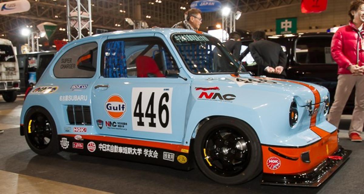 La Subaru R-2 est un kei de la fin des années 60, dérivé de la 360. Elle n’a pas grand chose de sportif. Ce n’est pas l’avis des élèves de l’école Jinno Gakuen, qui ont pris une R-2 et l’ont gavée de barres vitaminées !Ainsi, ils ont remplacé le bicylindre 360cm3 par un 4 cylindres turbo 660cm3 65ch de Subaru Vivio (pour que ça reste dans la famille.) Elle posséderait néanmoins des éléments de Daihatsu et de Suzuki.