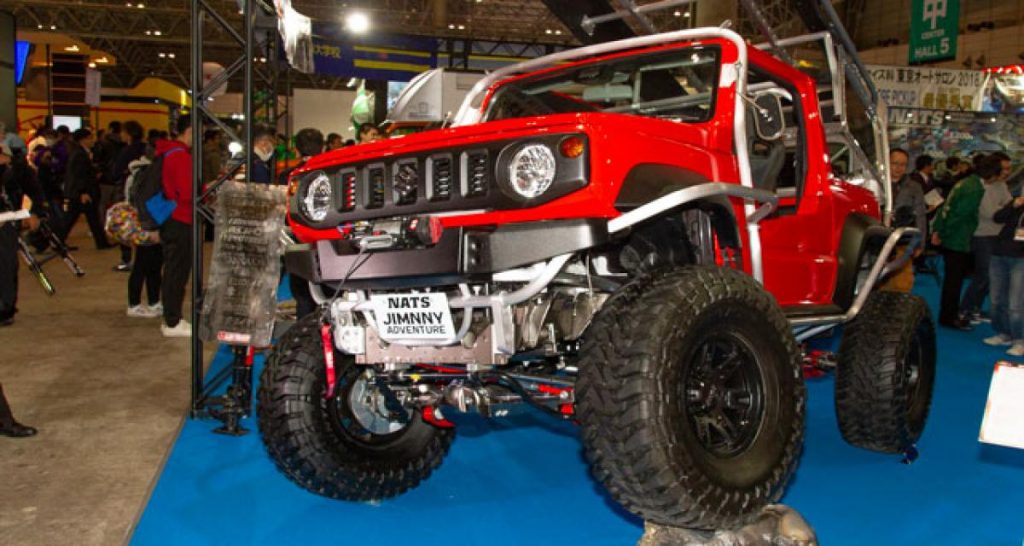 Le Jimny est un sérieux franchisseur, et tout un marché s’est développé autour des générations précédentes pour démultiplier ses capacités. Les Jimny haut sur pattes sont légion sur les routes et dans les chemins et il était logique que le nouveau y ait droit aussi. Tant qu’on y est, pourquoi pas un Monster Truck ? C’est curieusement le spécialiste de la Skyline R31 R31House qui s’y est collé, alors que les élèves du NATS ont créé une version extrême avec arceau externe, moins rigolote mais qui passe sûrement partout.